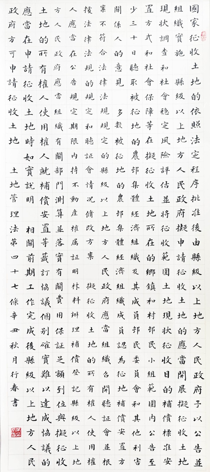 繼1600余位書法家參與書寫《中華人民共和國民法典》全部1260條法條之后,法治日報(bào)社聯(lián)合自然資源部法規(guī)司、自然資源部書畫研究會(huì)和北京昌平書法家協(xié)會(huì),將筆端對準(zhǔn)土地管理“一法一條例”,即《中華人民共和國土地管理法》和《中華人民共和國土地管理法實(shí)施條例》。