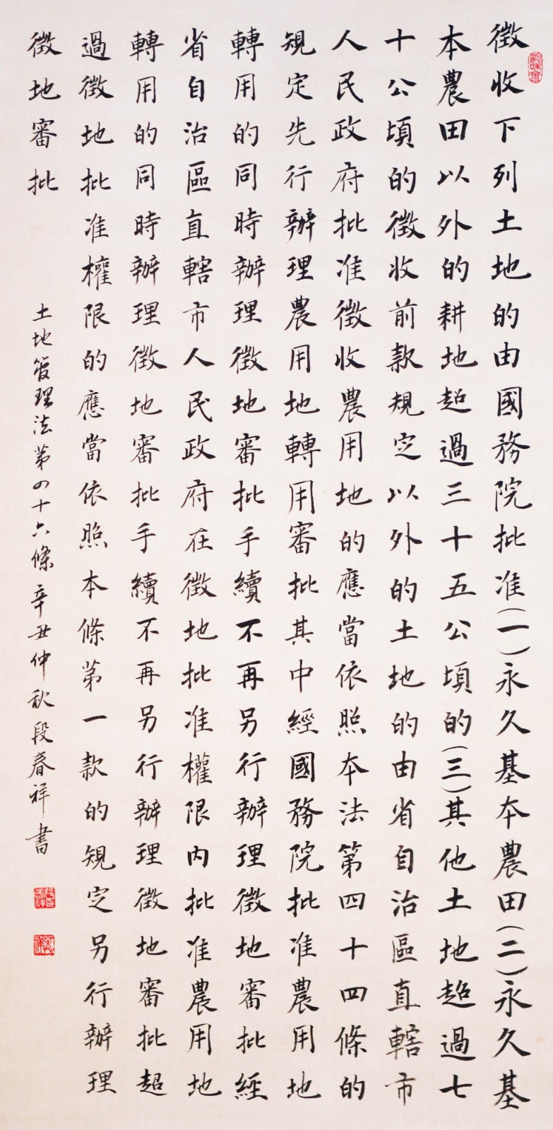 繼1600余位書法家參與書寫《中華人民共和國民法典》全部1260條法條之后,法治日?qǐng)?bào)社聯(lián)合自然資源部法規(guī)司、自然資源部書畫研究會(huì)和北京昌平書法家協(xié)會(huì),將筆端對(duì)準(zhǔn)土地管理“一法一條例”,即《中華人民共和國土地管理法》和《中華人民共和國土地管理法實(shí)施條例》。