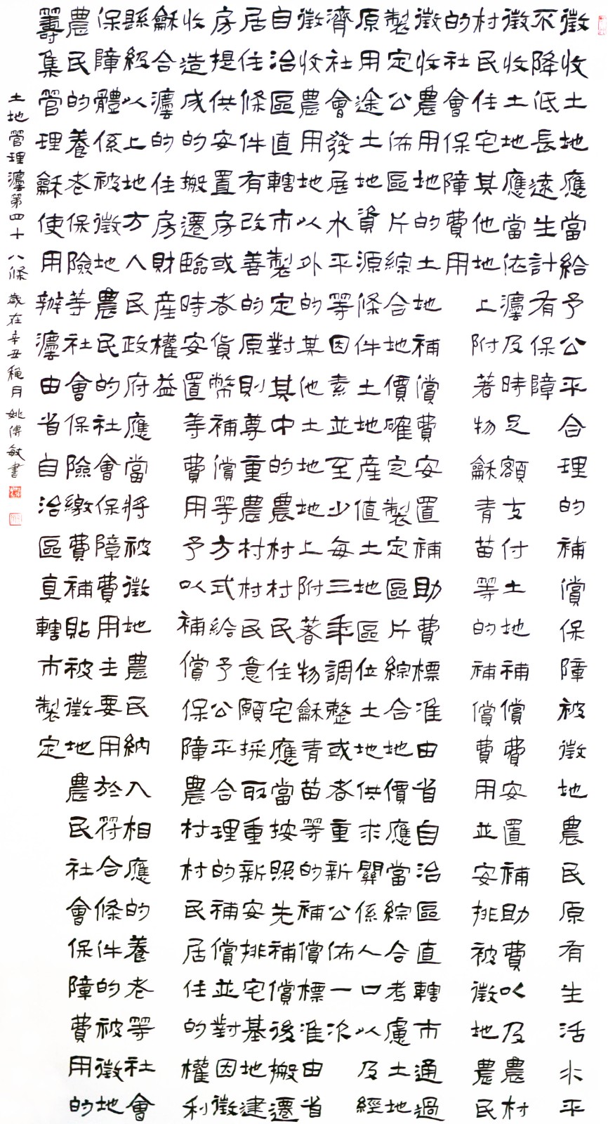 繼1600余位書法家參與書寫《中華人民共和國民法典》全部1260條法條之后,法治日報社聯(lián)合自然資源部法規(guī)司、自然資源部書畫研究會和北京昌平書法家協(xié)會,將筆端對準(zhǔn)土地管理“一法一條例”,即《中華人民共和國土地管理法》和《中華人民共和國土地管理法實施條例》。