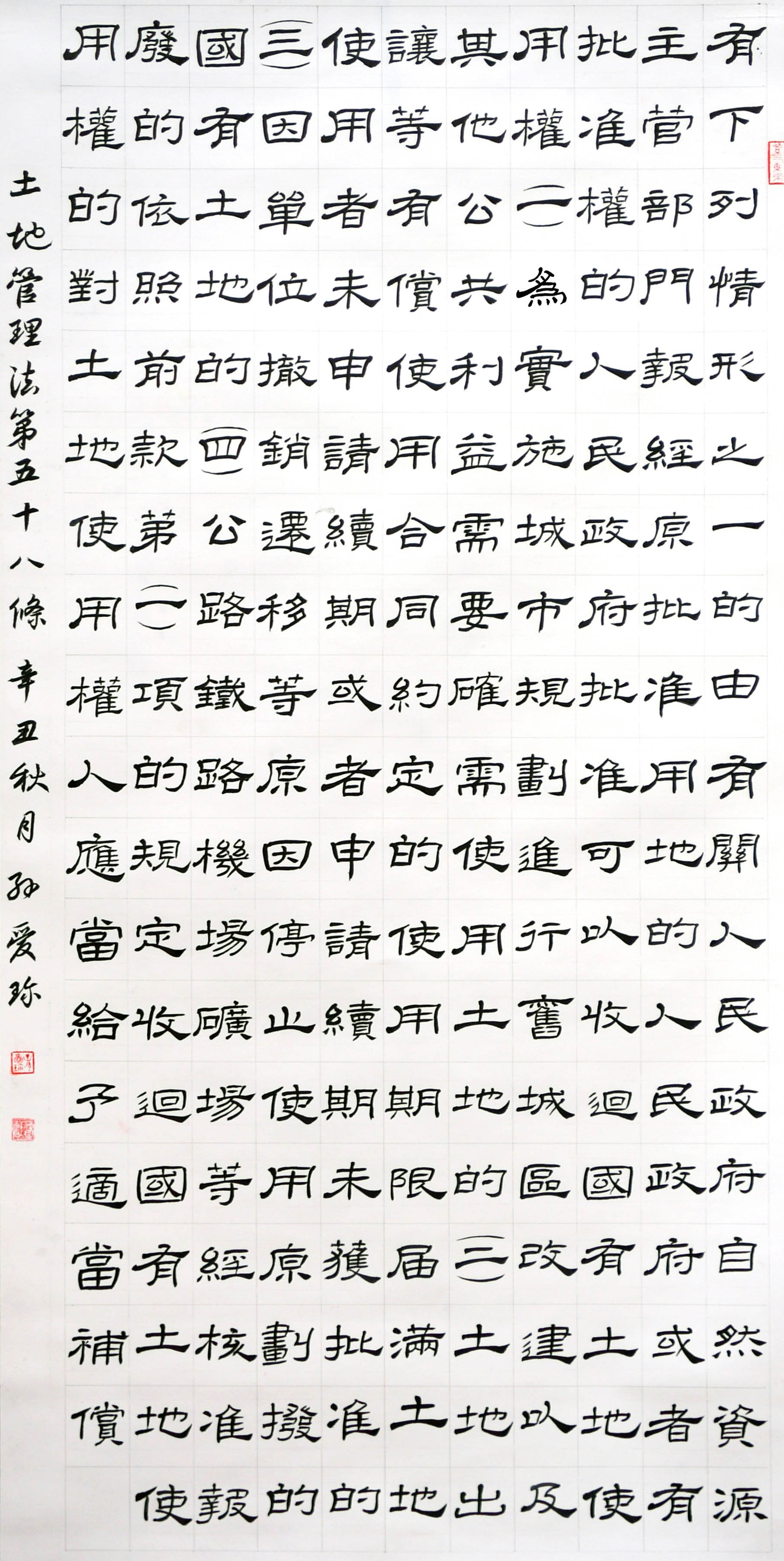 繼1600余位書法家參與書寫《中華人民共和國民法典》全部1260條法條之后,法治日報社聯(lián)合自然資源部法規(guī)司、自然資源部書畫研究會和北京昌平書法家協(xié)會,將筆端對準土地管理“一法一條例”,即《中華人民共和國土地管理法》和《中華人民共和國土地管理法實施條例》。