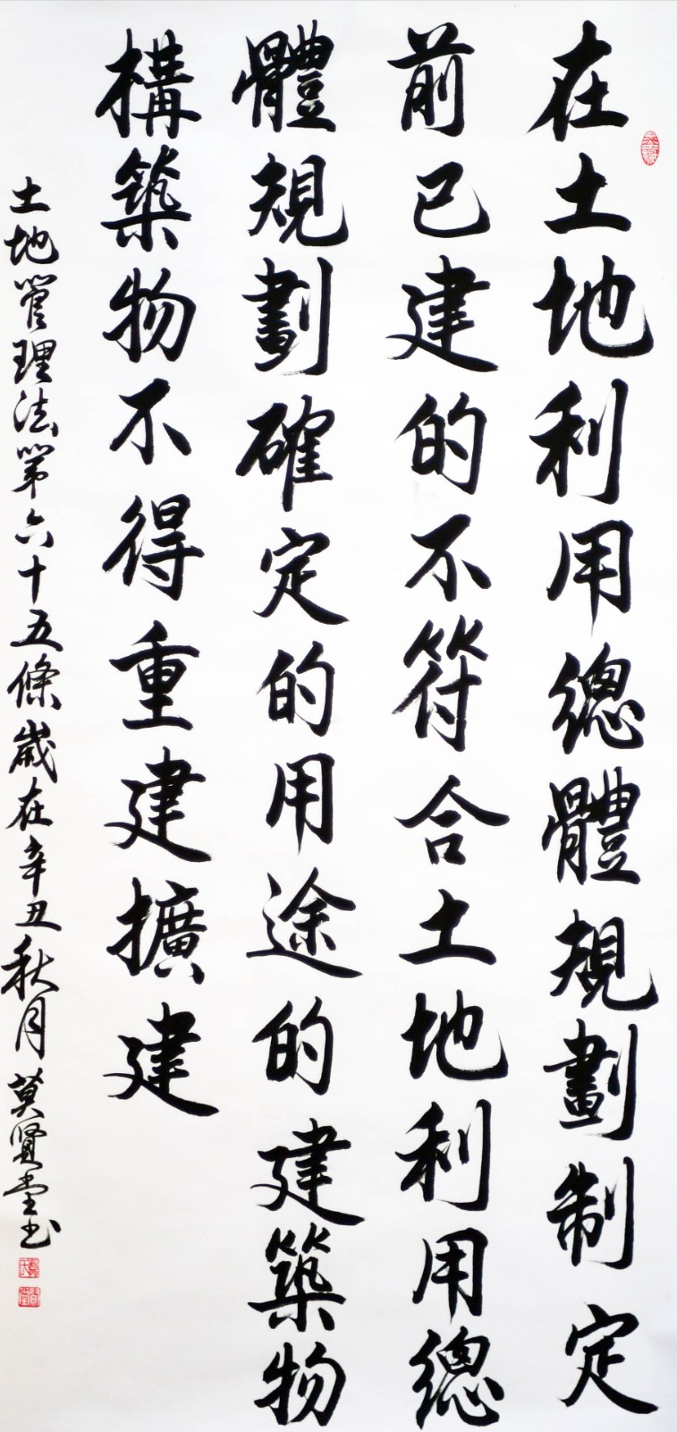 繼1600余位書法家參與書寫《中華人民共和國(guó)民法典》全部1260條法條之后,法治日?qǐng)?bào)社聯(lián)合自然資源部法規(guī)司、自然資源部書畫研究會(huì)和北京昌平書法家協(xié)會(huì),將筆端對(duì)準(zhǔn)土地管理“一法一條例”,即《中華人民共和國(guó)土地管理法》和《中華人民共和國(guó)土地管理法實(shí)施條例》。
