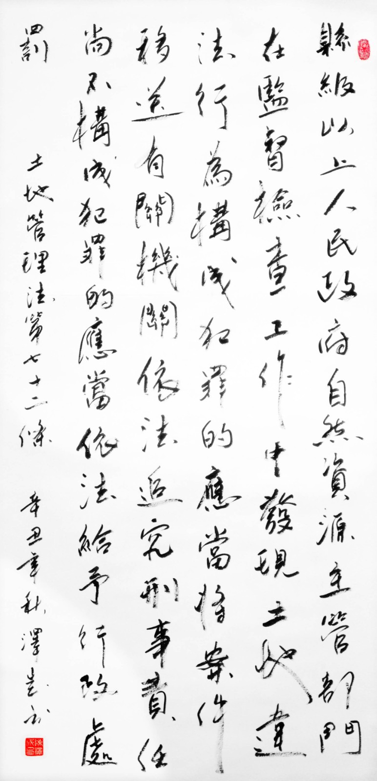 繼1600余位書法家參與書寫《中華人民共和國民法典》全部1260條法條之后,法治日?qǐng)?bào)社聯(lián)合自然資源部法規(guī)司、自然資源部書畫研究會(huì)和北京昌平書法家協(xié)會(huì),將筆端對(duì)準(zhǔn)土地管理“一法一條例”,即《中華人民共和國土地管理法》和《中華人民共和國土地管理法實(shí)施條例》。
