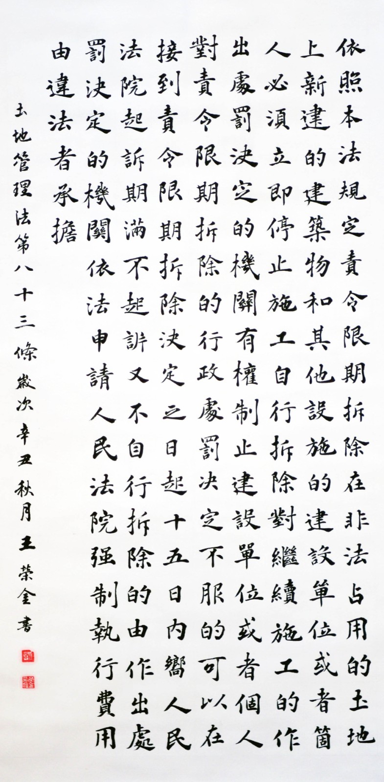 繼1600余位書法家參與書寫《中華人民共和國民法典》全部1260條法條之后,法治日報社聯(lián)合自然資源部法規(guī)司、自然資源部書畫研究會和北京昌平書法家協(xié)會,將筆端對準(zhǔn)土地管理“一法一條例”,即《中華人民共和國土地管理法》和《中華人民共和國土地管理法實施條例》。