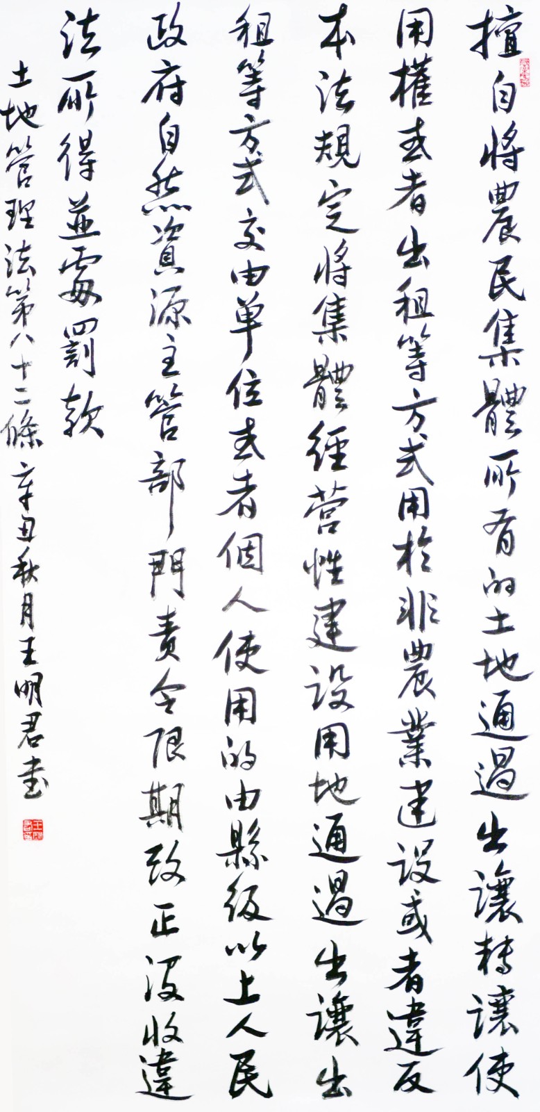 繼1600余位書法家參與書寫《中華人民共和國民法典》全部1260條法條之后,法治日報社聯(lián)合自然資源部法規(guī)司、自然資源部書畫研究會和北京昌平書法家協(xié)會,將筆端對準(zhǔn)土地管理“一法一條例”,即《中華人民共和國土地管理法》和《中華人民共和國土地管理法實施條例》。