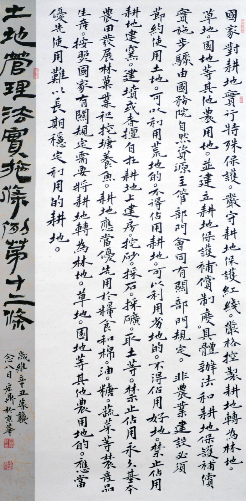 繼1600余位書法家參與書寫《中華人民共和國民法典》全部1260條法條之后,法治日報社聯(lián)合自然資源部法規(guī)司、自然資源部書畫研究會和北京昌平書法家協(xié)會,將筆端對準(zhǔn)土地管理“一法一條例”,即《中華人民共和國土地管理法》和《中華人民共和國土地管理法實(shí)施條例》。