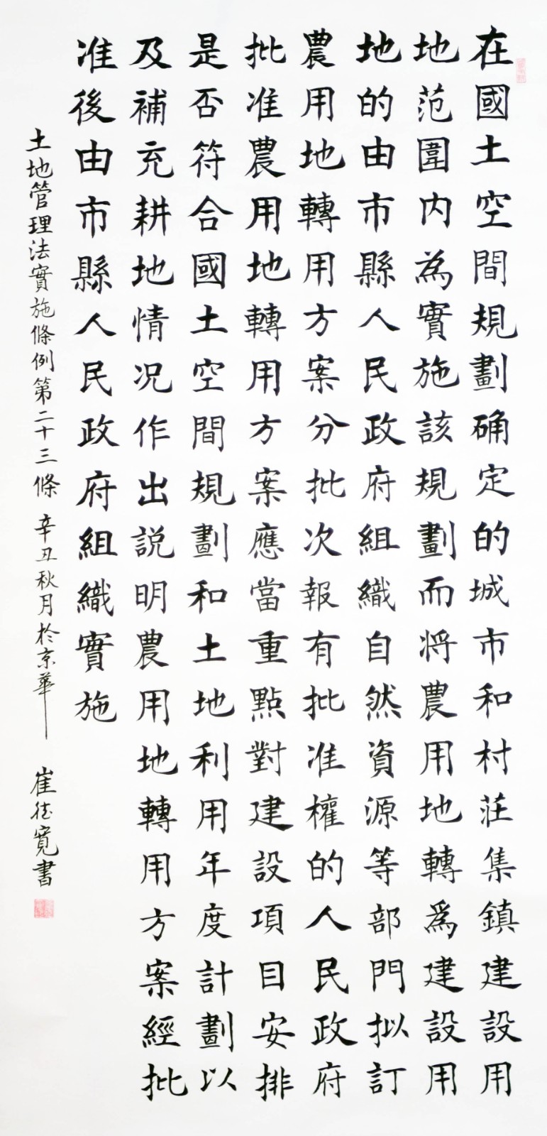 繼1600余位書法家參與書寫《中華人民共和國民法典》全部1260條法條之后,法治日報社聯(lián)合自然資源部法規(guī)司、自然資源部書畫研究會和北京昌平書法家協(xié)會,將筆端對準(zhǔn)土地管理“一法一條例”,即《中華人民共和國土地管理法》和《中華人民共和國土地管理法實(shí)施條例》。