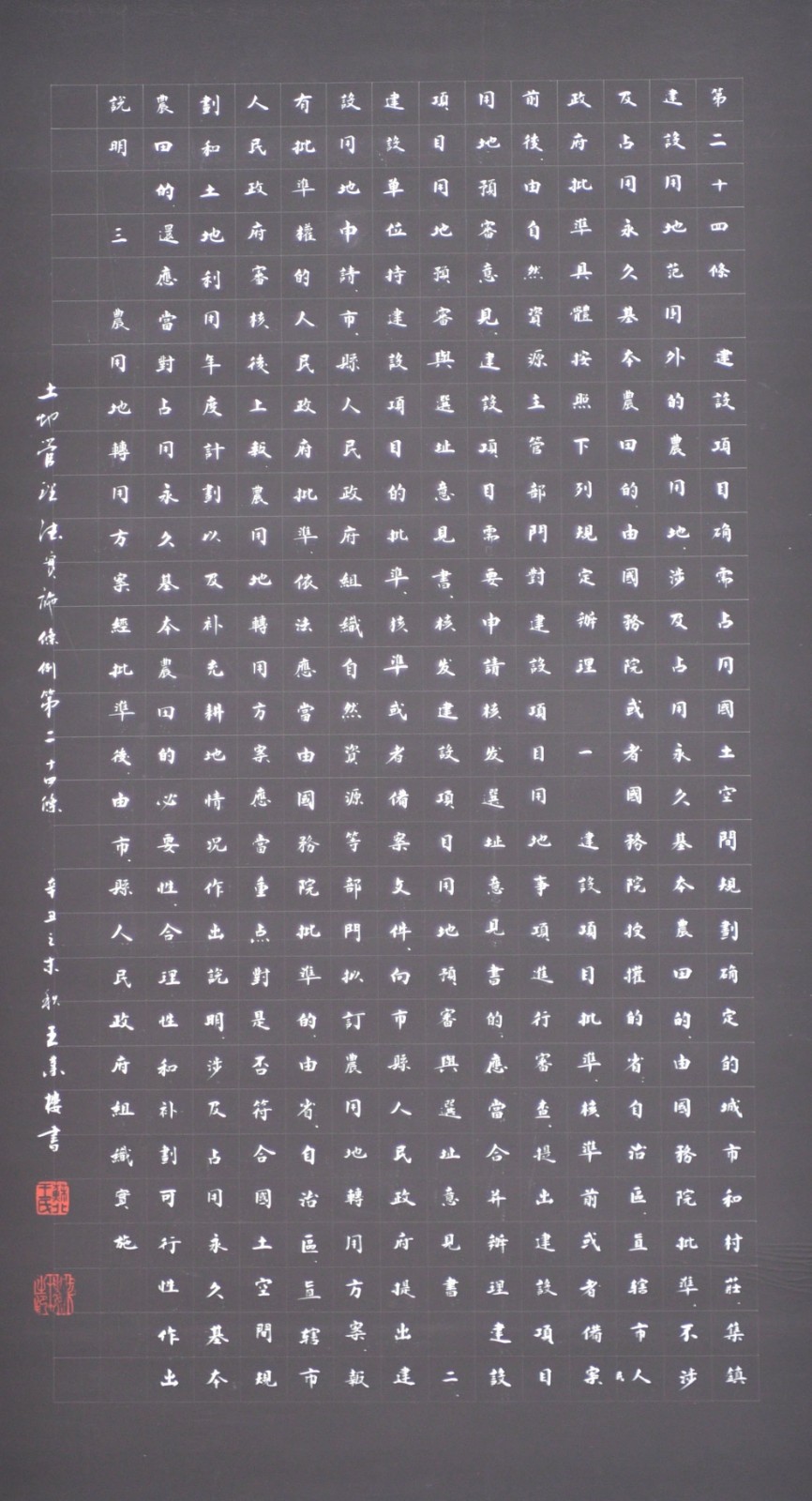 繼1600余位書(shū)法家參與書(shū)寫(xiě)《中華人民共和國(guó)民法典》全部1260條法條之后,法治日?qǐng)?bào)社聯(lián)合自然資源部法規(guī)司、自然資源部書(shū)畫(huà)研究會(huì)和北京昌平書(shū)法家協(xié)會(huì),將筆端對(duì)準(zhǔn)土地管理“一法一條例”,即《中華人民共和國(guó)土地管理法》和《中華人民共和國(guó)土地管理法實(shí)施條例》。