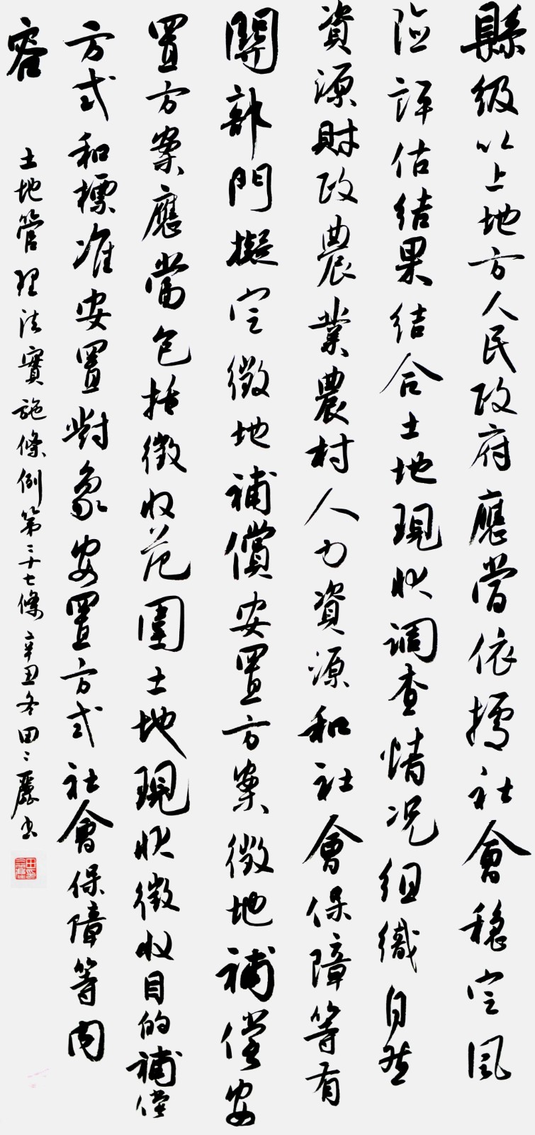 繼1600余位書法家參與書寫《中華人民共和國民法典》全部1260條法條之后,法治日?qǐng)?bào)社聯(lián)合自然資源部法規(guī)司、自然資源部書畫研究會(huì)和北京昌平書法家協(xié)會(huì),將筆端對(duì)準(zhǔn)土地管理“一法一條例”,即《中華人民共和國土地管理法》和《中華人民共和國土地管理法實(shí)施條例》。