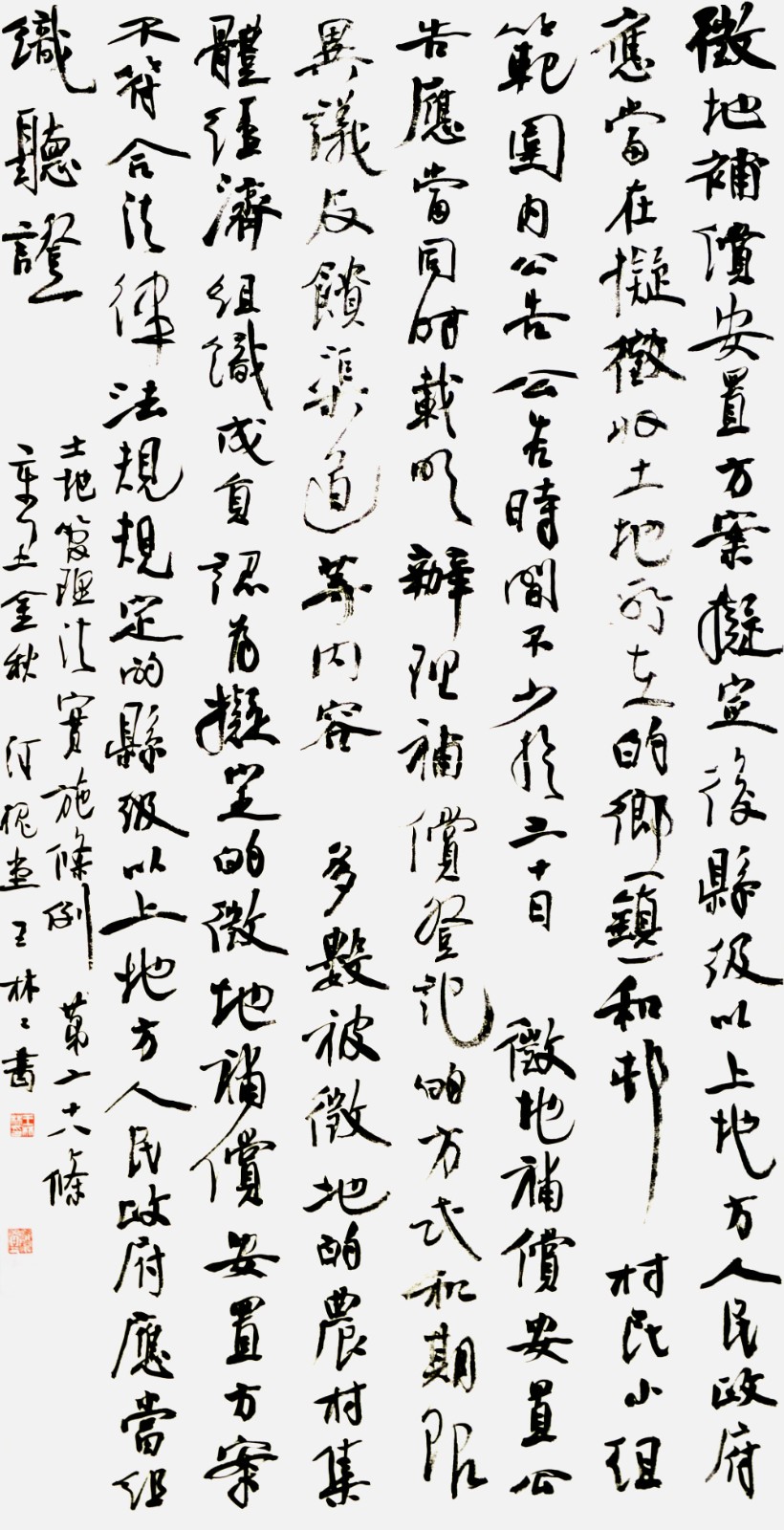 繼1600余位書法家參與書寫《中華人民共和國民法典》全部1260條法條之后,法治日報(bào)社聯(lián)合自然資源部法規(guī)司、自然資源部書畫研究會和北京昌平書法家協(xié)會,將筆端對準(zhǔn)土地管理“一法一條例”,即《中華人民共和國土地管理法》和《中華人民共和國土地管理法實(shí)施條例》。