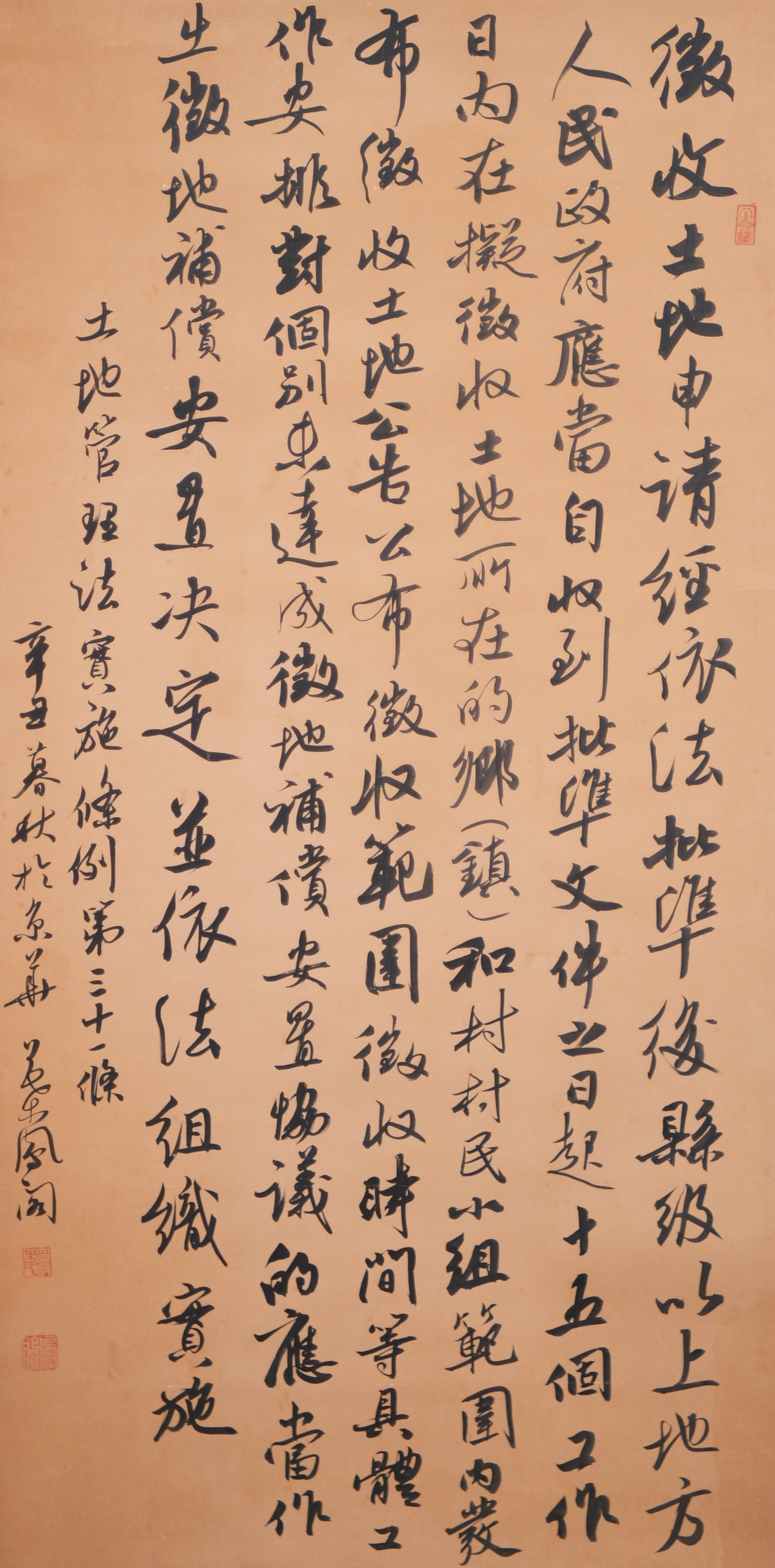 繼1600余位書法家參與書寫《中華人民共和國民法典》全部1260條法條之后,法治日報社聯(lián)合自然資源部法規(guī)司、自然資源部書畫研究會和北京昌平書法家協(xié)會,將筆端對準土地管理“一法一條例”,即《中華人民共和國土地管理法》和《中華人民共和國土地管理法實施條例》。