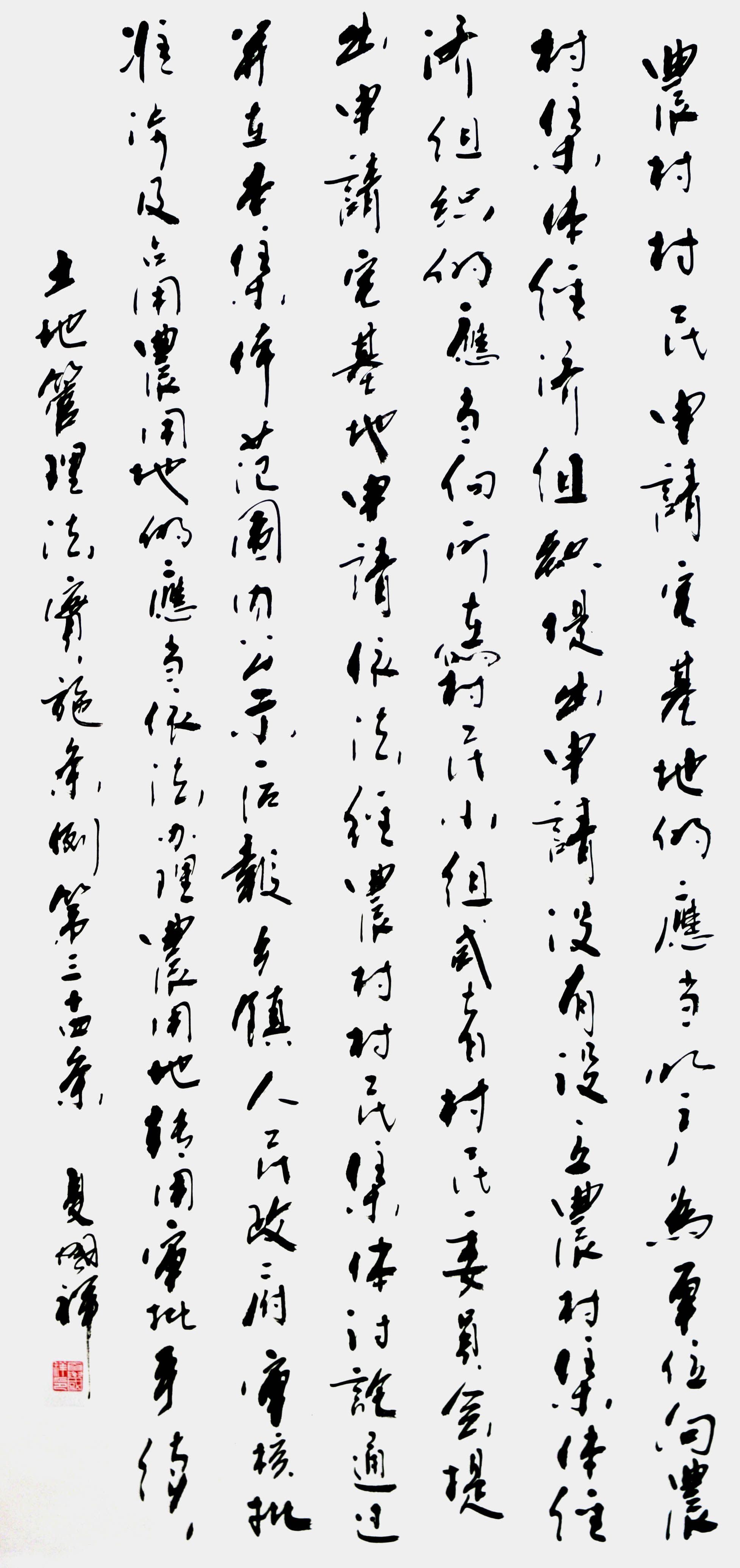 繼1600余位書法家參與書寫《中華人民共和國民法典》全部1260條法條之后,法治日報(bào)社聯(lián)合自然資源部法規(guī)司、自然資源部書畫研究會(huì)和北京昌平書法家協(xié)會(huì),將筆端對(duì)準(zhǔn)土地管理“一法一條例”,即《中華人民共和國土地管理法》和《中華人民共和國土地管理法實(shí)施條例》。