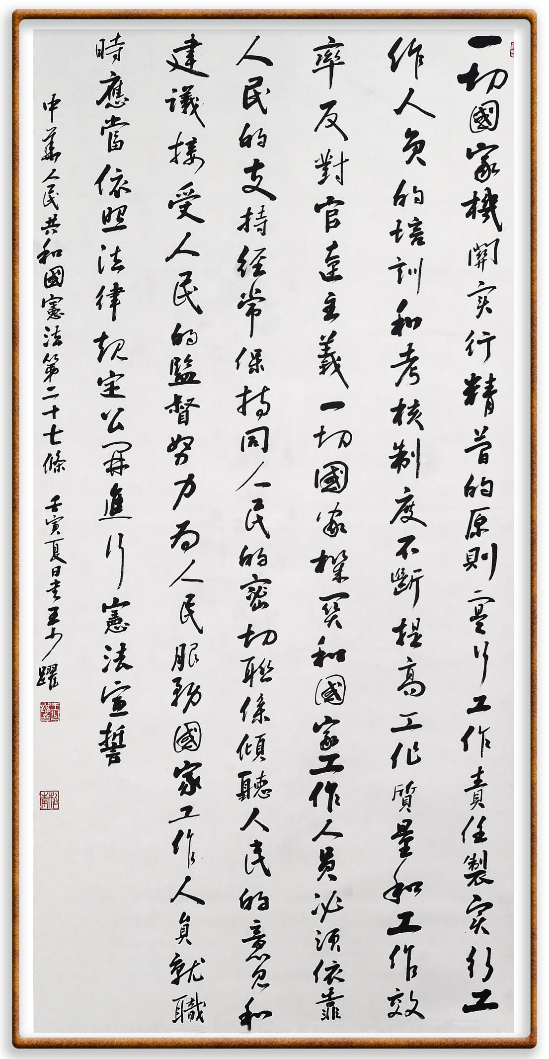 繼《中華人民共和國(guó)民法典》《中華人民共和國(guó)土地管理法》《中華人民共和國(guó)土地管理法實(shí)施條例》《中華人民共和國(guó)法律援助法》之后,法治日?qǐng)?bào)社聯(lián)合北京市司法局、北京市書法家協(xié)會(huì),將筆端對(duì)準(zhǔn)《中華人民共和國(guó)憲法》和《中華人民共和國(guó)行政處罰法》。