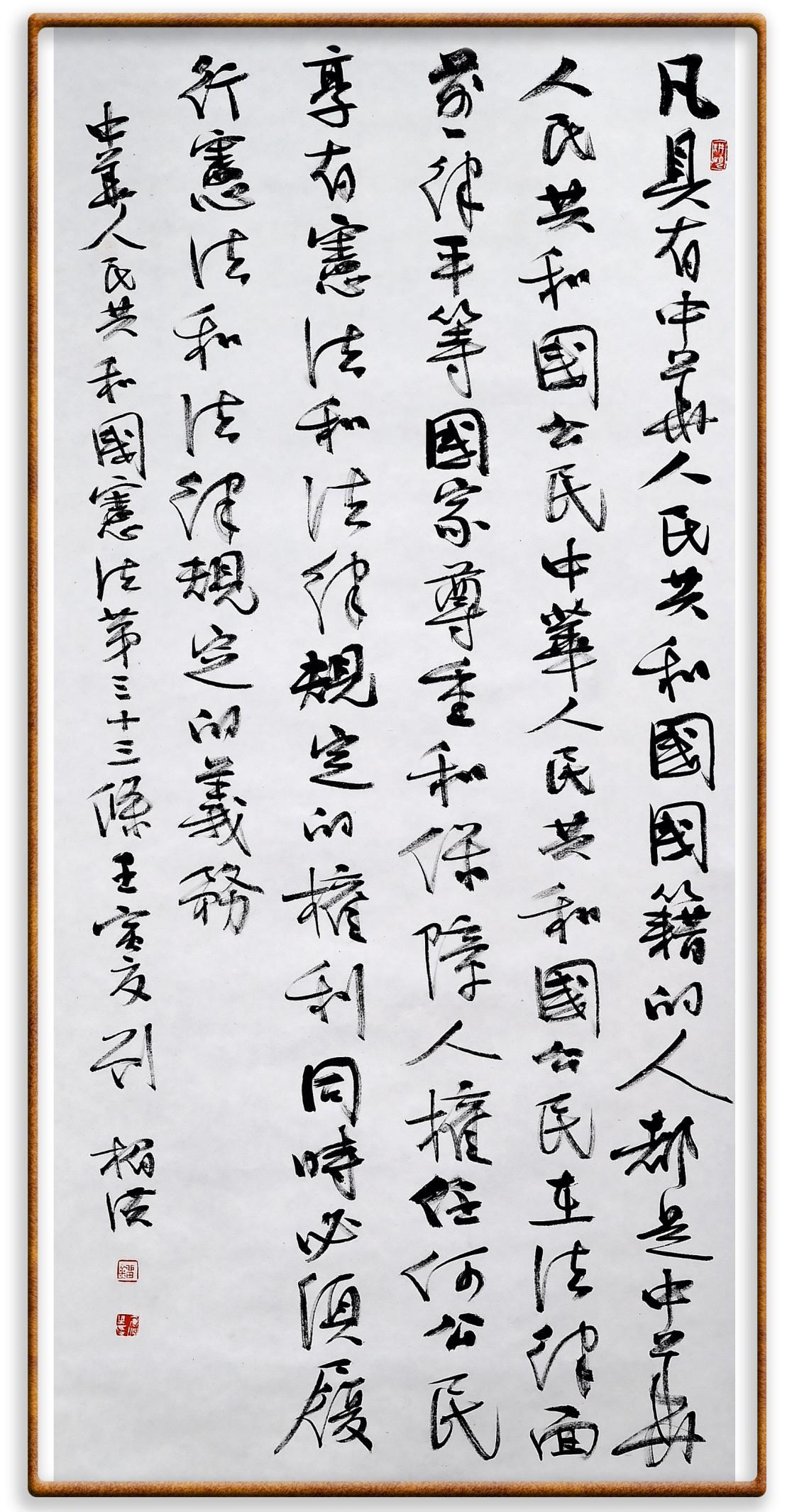 繼《中華人民共和國(guó)民法典》《中華人民共和國(guó)土地管理法》《中華人民共和國(guó)土地管理法實(shí)施條例》《中華人民共和國(guó)法律援助法》之后,法治日?qǐng)?bào)社聯(lián)合北京市司法局、北京市書法家協(xié)會(huì),將筆端對(duì)準(zhǔn)《中華人民共和國(guó)憲法》和《中華人民共和國(guó)行政處罰法》。