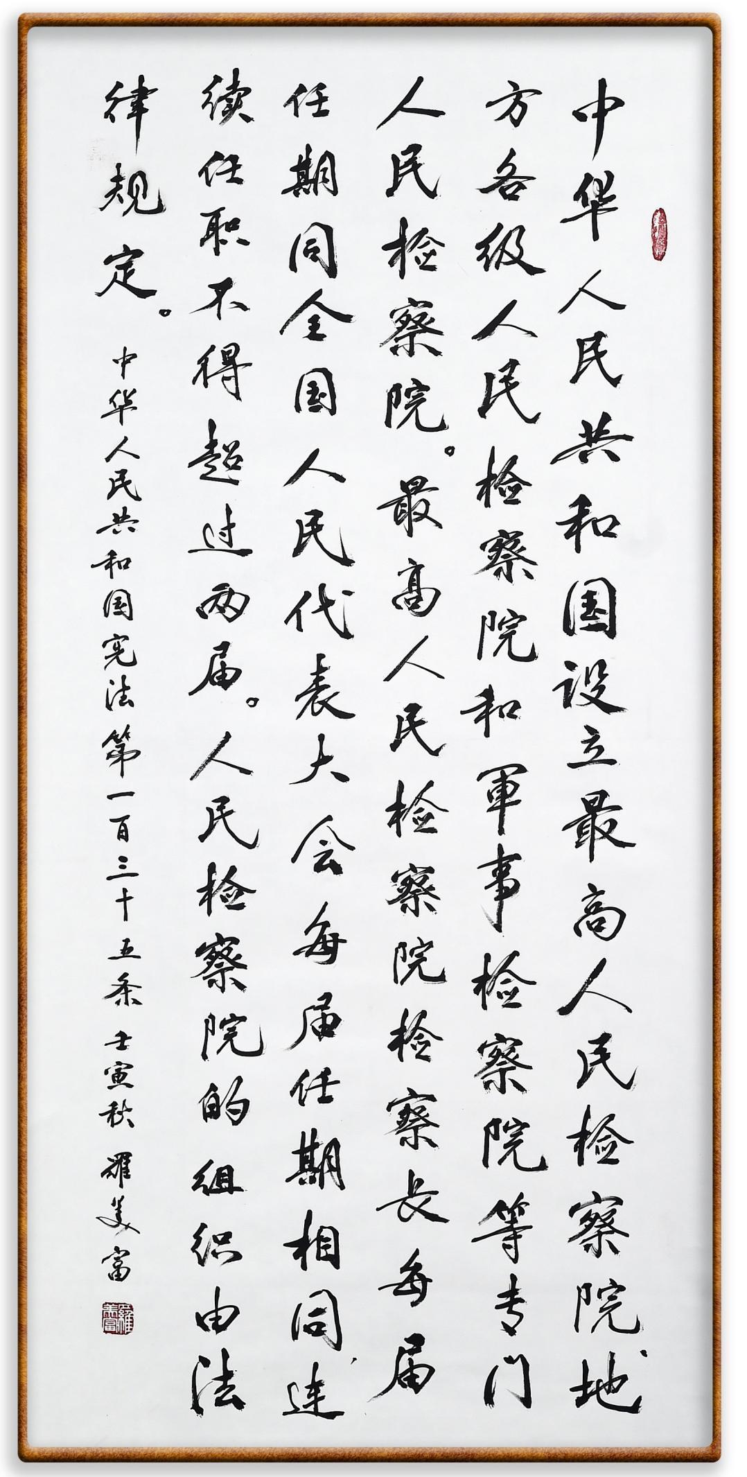 繼《中華人民共和國(guó)民法典》《中華人民共和國(guó)土地管理法》《中華人民共和國(guó)土地管理法實(shí)施條例》《中華人民共和國(guó)法律援助法》之后,法治日?qǐng)?bào)社聯(lián)合北京市司法局、北京書(shū)法家協(xié)會(huì),將筆端對(duì)準(zhǔn)《中華人民共和國(guó)憲法》和《中華人民共和國(guó)行政處罰法》。