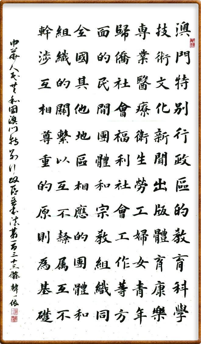 澳門基本法第一百三十三條 澳門特別行政區(qū)的教育、科學(xué)、技術(shù)、文化、新聞、出版、體育、康樂、專業(yè)、醫(yī)療衛(wèi)生、勞工、婦女、青年、歸僑、社會(huì)福利、社會(huì)工作等方面的民間團(tuán)體和宗教組織同全國其他地區(qū)相應(yīng)的團(tuán)體和組織的關(guān)系,以互不隸屬、互不干涉、互相尊重的原則為基礎(chǔ)。