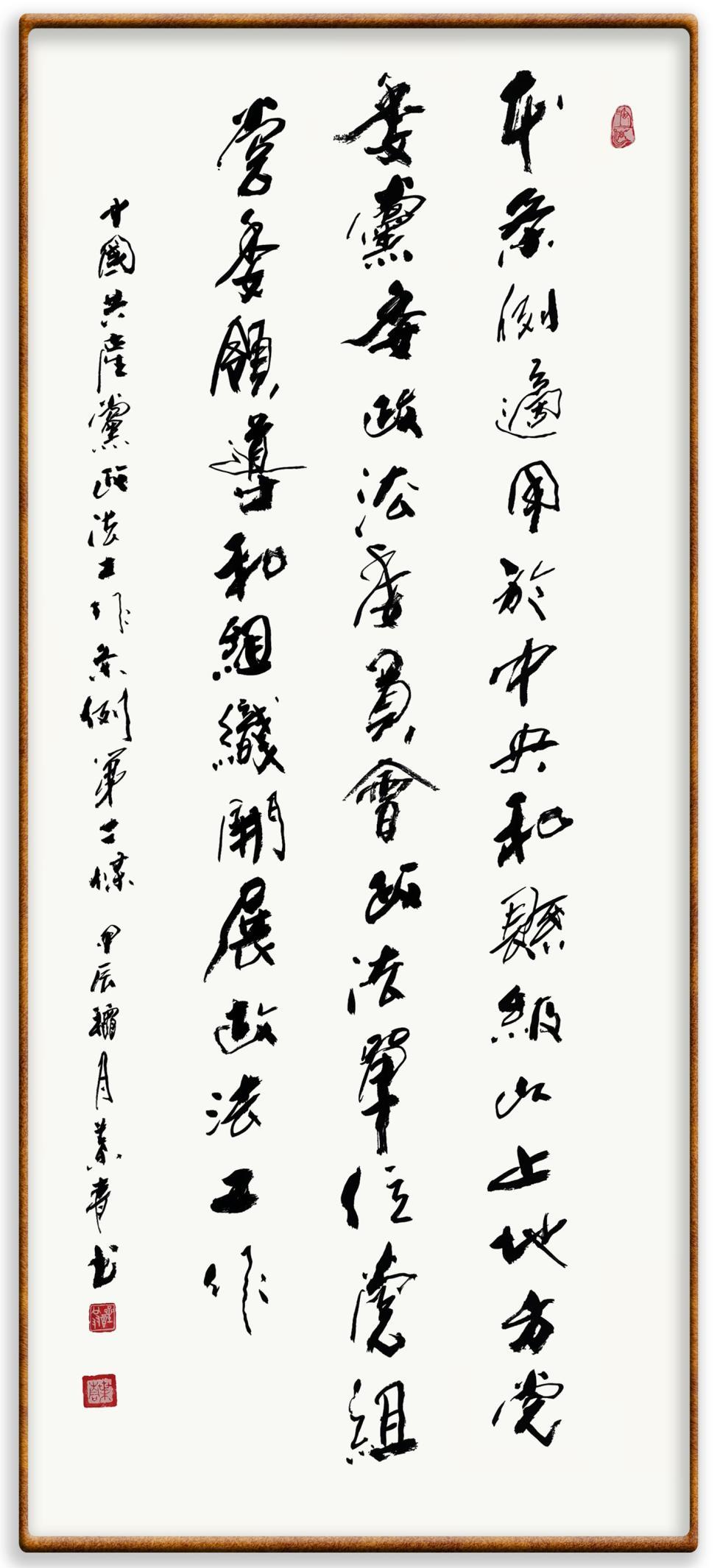 《中國(guó)共產(chǎn)黨政法工作條例》對(duì)黨領(lǐng)導(dǎo)新時(shí)代政法工作進(jìn)行全面制度擘畫(huà),為黨領(lǐng)導(dǎo)政法工作提供基本遵循,具有重大而深遠(yuǎn)的意義。為學(xué)習(xí)好、宣傳好、貫徹好、實(shí)施好這部黨內(nèi)法規(guī),繼《中華人民共和國(guó)民法典》《中華人民共和國(guó)憲法》《信訪工作條例》《中華人民共和國(guó)澳門特別行政區(qū)基本法》《中華人民共和國(guó)香港特別行政區(qū)基本法》等法律法規(guī)之后,“書(shū)·法”系列活動(dòng)將筆端對(duì)準(zhǔn)《中國(guó)共產(chǎn)黨政法工作條例》。