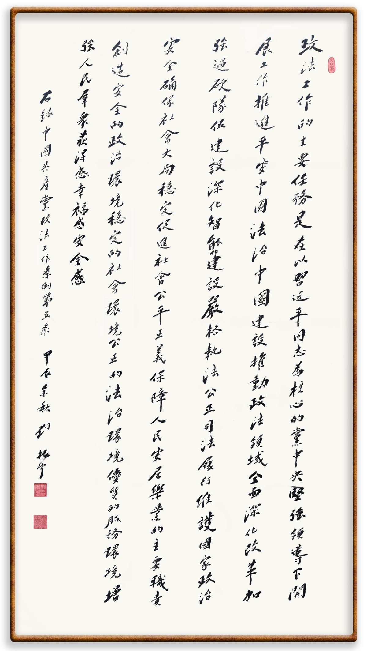 《中國共產(chǎn)黨政法工作條例》對黨領(lǐng)導(dǎo)新時代政法工作進(jìn)行全面制度擘畫,為黨領(lǐng)導(dǎo)政法工作提供基本遵循,具有重大而深遠(yuǎn)的意義。為學(xué)習(xí)好、宣傳好、貫徹好、實(shí)施好這部黨內(nèi)法規(guī),繼《中華人民共和國民法典》《中華人民共和國憲法》《信訪工作條例》《中華人民共和國澳門特別行政區(qū)基本法》《中華人民共和國香港特別行政區(qū)基本法》等法律法規(guī)之后,“書·法”系列活動將筆端對準(zhǔn)《中國共產(chǎn)黨政法工作條例》。