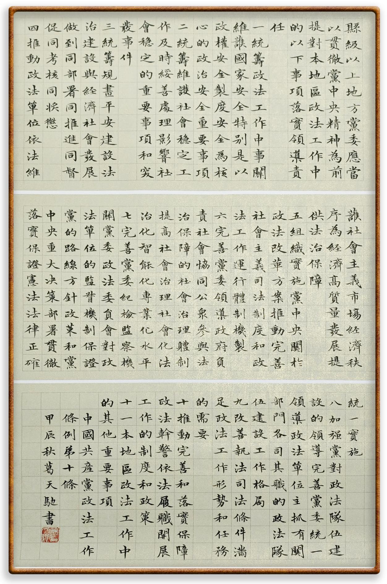 《中國共產(chǎn)黨政法工作條例》對黨領(lǐng)導(dǎo)新時代政法工作進(jìn)行全面制度擘畫,為黨領(lǐng)導(dǎo)政法工作提供基本遵循,具有重大而深遠(yuǎn)的意義。為學(xué)習(xí)好、宣傳好、貫徹好、實施好這部黨內(nèi)法規(guī),繼《中華人民共和國民法典》《中華人民共和國憲法》《信訪工作條例》《中華人民共和國澳門特別行政區(qū)基本法》《中華人民共和國香港特別行政區(qū)基本法》等法律法規(guī)之后,“書·法”系列活動將筆端對準(zhǔn)《中國共產(chǎn)黨政法工作條例》。
