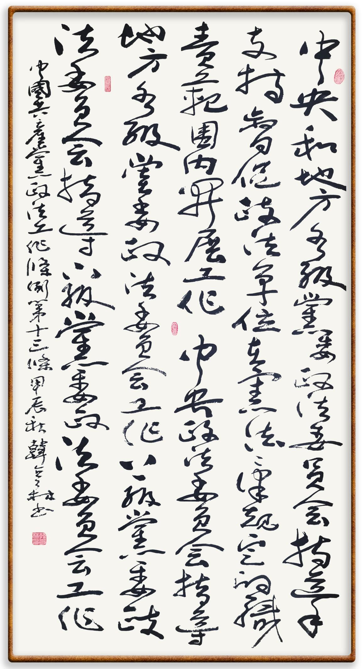 《中國共產(chǎn)黨政法工作條例》對黨領(lǐng)導新時代政法工作進行全面制度擘畫,為黨領(lǐng)導政法工作提供基本遵循,具有重大而深遠的意義。為學習好、宣傳好、貫徹好、實施好這部黨內(nèi)法規(guī),繼《中華人民共和國民法典》《中華人民共和國憲法》《信訪工作條例》《中華人民共和國澳門特別行政區(qū)基本法》《中華人民共和國香港特別行政區(qū)基本法》等法律法規(guī)之后,“書·法”系列活動將筆端對準《中國共產(chǎn)黨政法工作條例》。