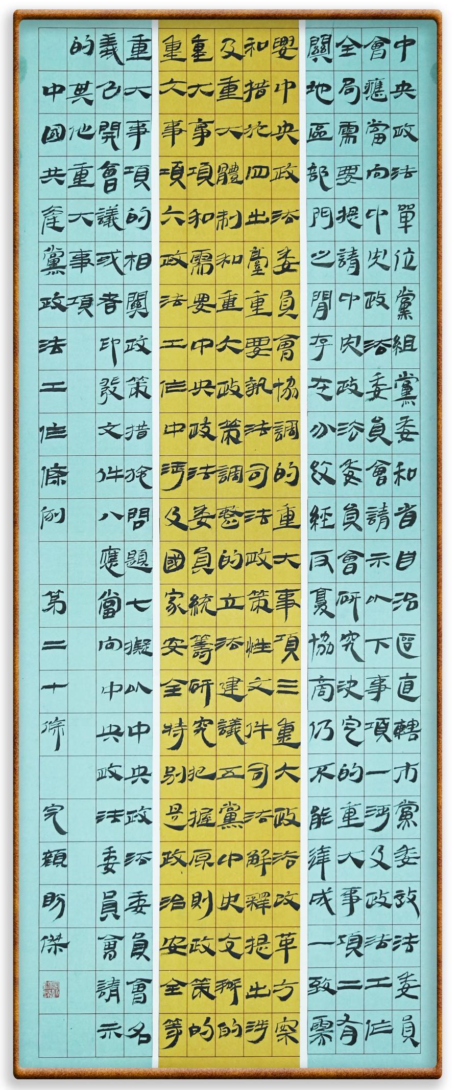 《中國共產(chǎn)黨政法工作條例》對黨領導新時代政法工作進行全面制度擘畫,為黨領導政法工作提供基本遵循,具有重大而深遠的意義。為學習好、宣傳好、貫徹好、實施好這部黨內(nèi)法規(guī),繼《中華人民共和國民法典》《中華人民共和國憲法》《信訪工作條例》《中華人民共和國澳門特別行政區(qū)基本法》《中華人民共和國香港特別行政區(qū)基本法》等法律法規(guī)之后,“書·法”系列活動將筆端對準《中國共產(chǎn)黨政法工作條例》。