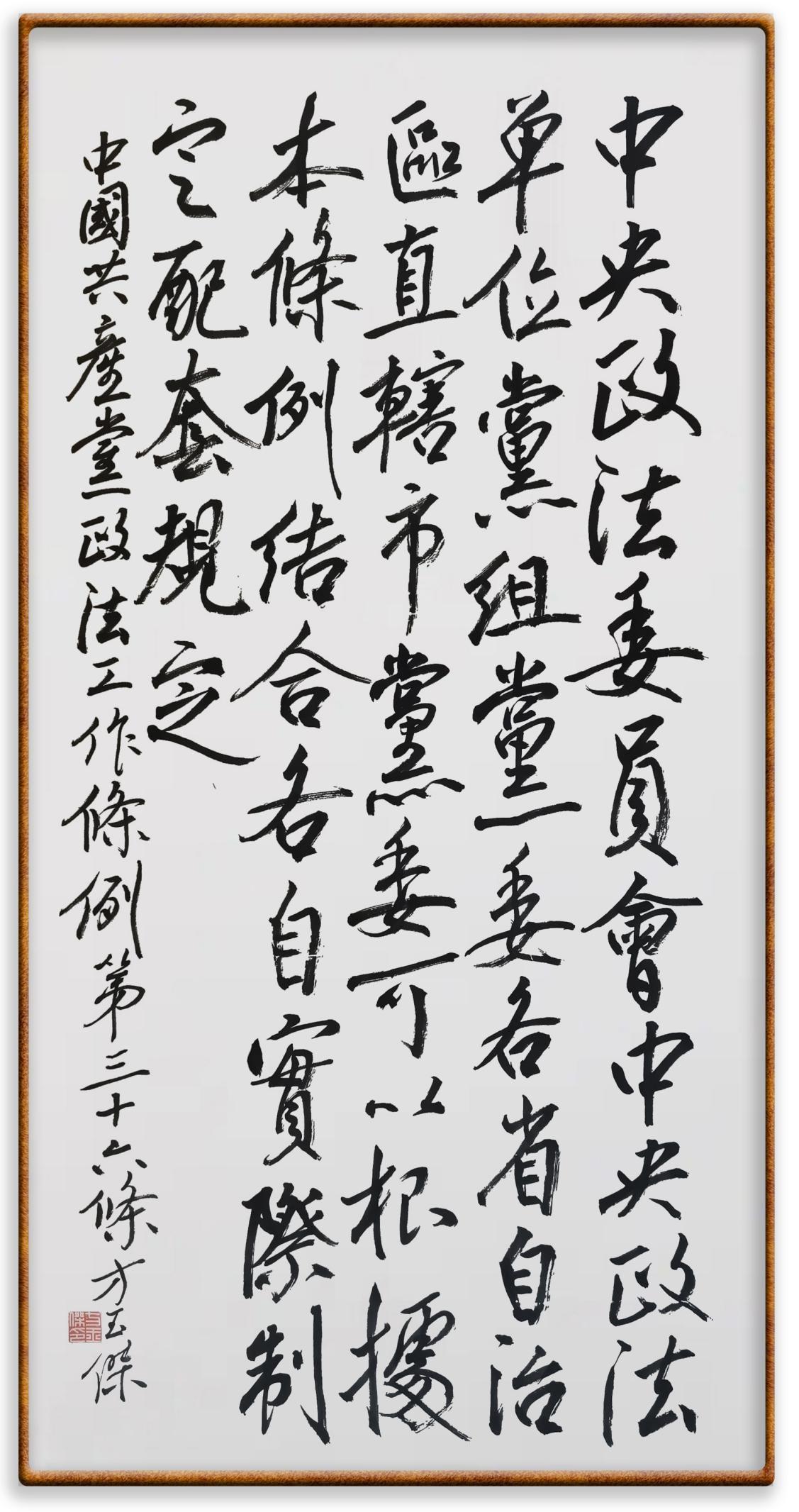 《中國共產(chǎn)黨政法工作條例》對黨領(lǐng)導(dǎo)新時代政法工作進行全面制度擘畫,為黨領(lǐng)導(dǎo)政法工作提供基本遵循,具有重大而深遠的意義。為學(xué)習(xí)好、宣傳好、貫徹好、實施好這部黨內(nèi)法規(guī),繼《中華人民共和國民法典》《中華人民共和國憲法》《信訪工作條例》《中華人民共和國澳門特別行政區(qū)基本法》《中華人民共和國香港特別行政區(qū)基本法》等法律法規(guī)之后,“書·法”系列活動將筆端對準《中國共產(chǎn)黨政法工作條例》。