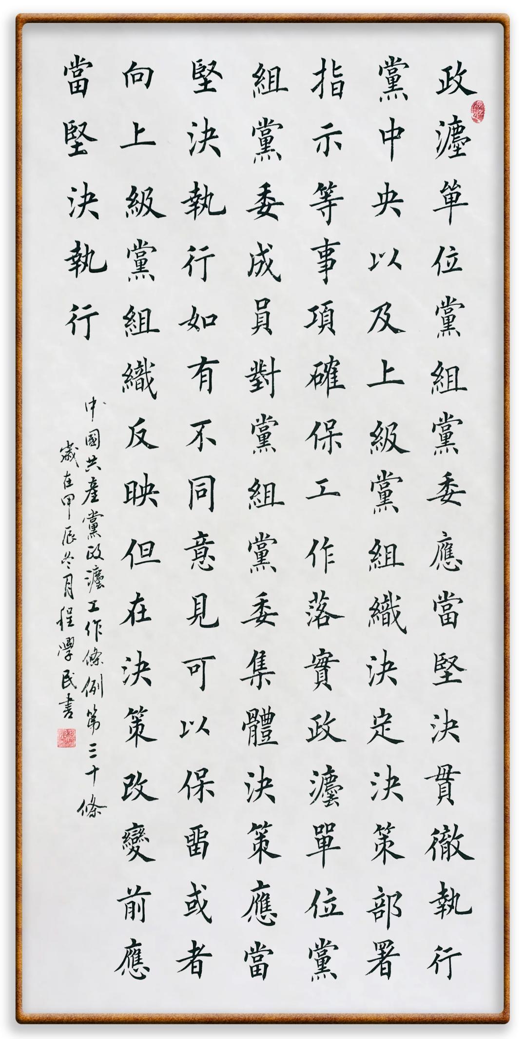 《中國(guó)共產(chǎn)黨政法工作條例》對(duì)黨領(lǐng)導(dǎo)新時(shí)代政法工作進(jìn)行全面制度擘畫(huà),為黨領(lǐng)導(dǎo)政法工作提供基本遵循,具有重大而深遠(yuǎn)的意義。為學(xué)習(xí)好、宣傳好、貫徹好、實(shí)施好這部黨內(nèi)法規(guī),繼《中華人民共和國(guó)民法典》《中華人民共和國(guó)憲法》《信訪工作條例》《中華人民共和國(guó)澳門(mén)特別行政區(qū)基本法》《中華人民共和國(guó)香港特別行政區(qū)基本法》等法律法規(guī)之后,“書(shū)·法”系列活動(dòng)將筆端對(duì)準(zhǔn)《中國(guó)共產(chǎn)黨政法工作條例》。