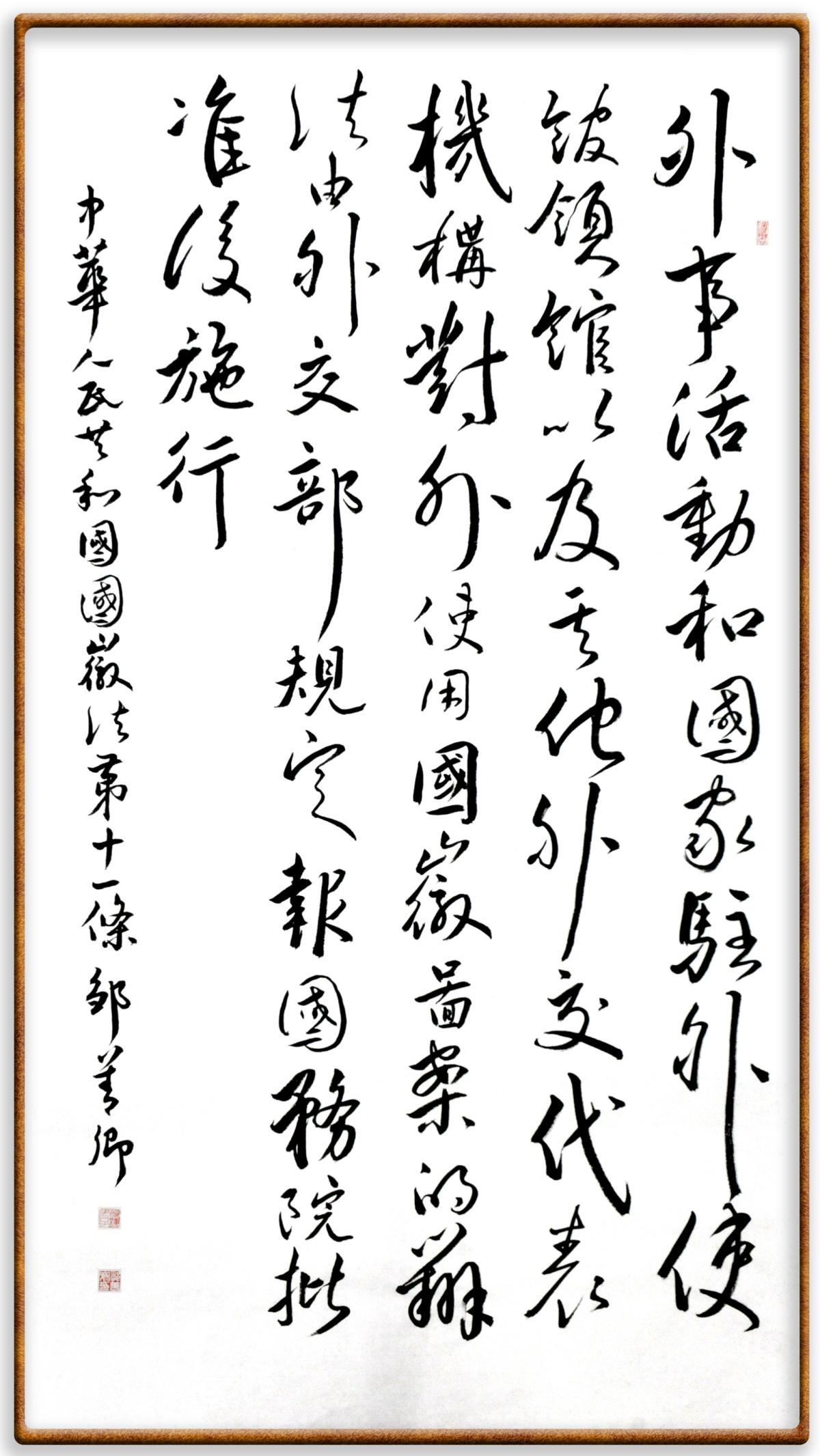 國徽法第十一條 外事活動和國家駐外使館、領(lǐng)館以及其他外交代表機構(gòu)對外使用國徽圖案的辦法,由外交部規(guī)定,報國務(wù)院批準(zhǔn)后施行。