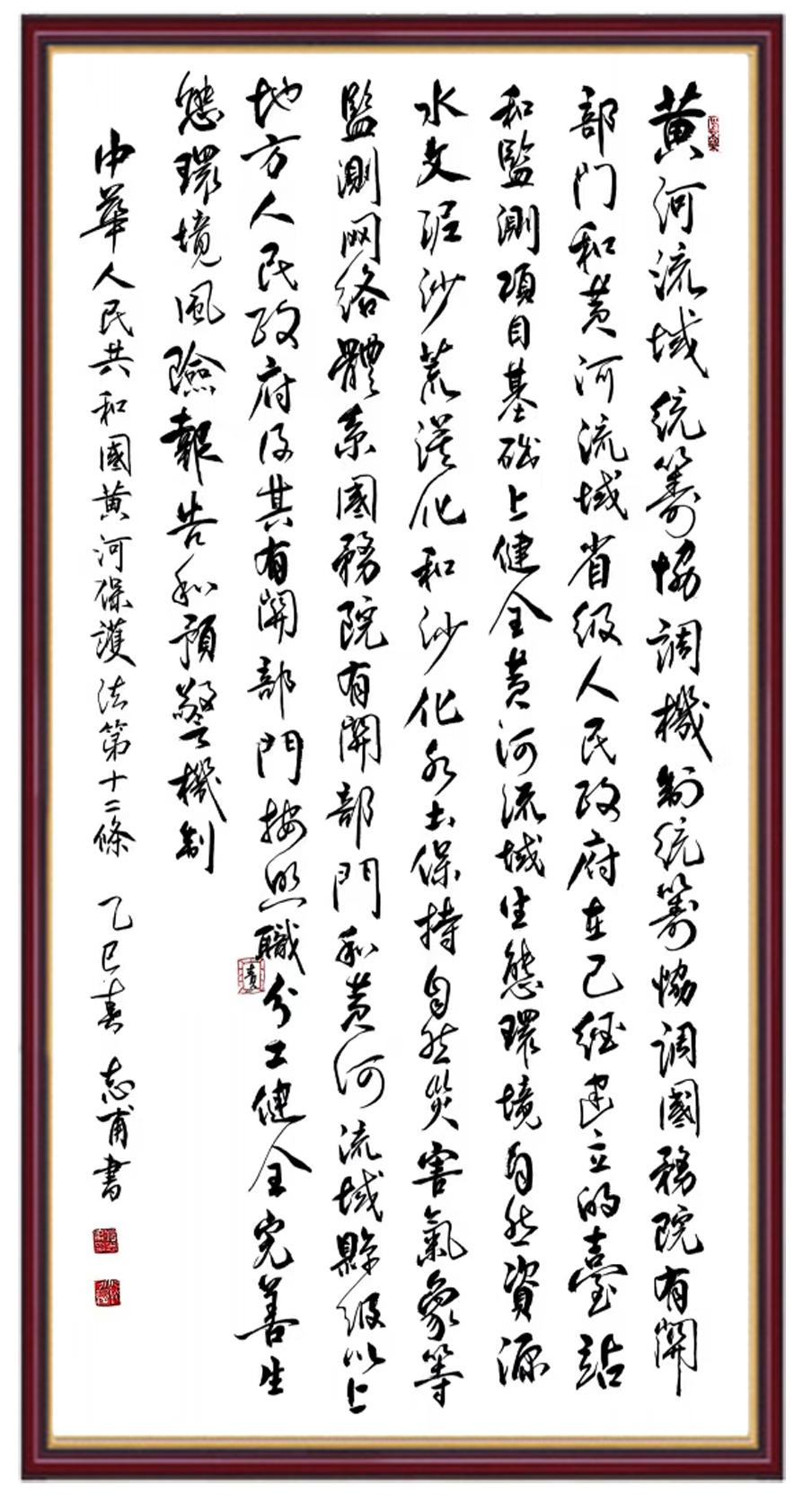 黃河寧,天下平。黃河是中華民族的發(fā)源地和搖籃,保護黃河是事關中華民族偉大復興的千秋大計?!吨腥A人民共和國黃河保護法》為推進水資源節(jié)約集約利用、保護傳承弘揚黃河文化、推動黃河流域生態(tài)保護和高質量發(fā)展提供了有力法治保障。繼書寫《中華人民共和國民法典》《中華人民共和國憲法》《中華人民共和國澳門特別行政區(qū)基本法》《中華人民共和國香港特別行政區(qū)基本法》《中華人民共和國國旗法》《中華人民共和國國徽法》《中華人民共和國國歌法》《中華人民共和國法官法》等法律法規(guī)之后,法制日報社聯(lián)合沿黃九省(區(qū))司法廳、書法家協(xié)會,將筆端對準《中華人民共和國黃河保護法》。