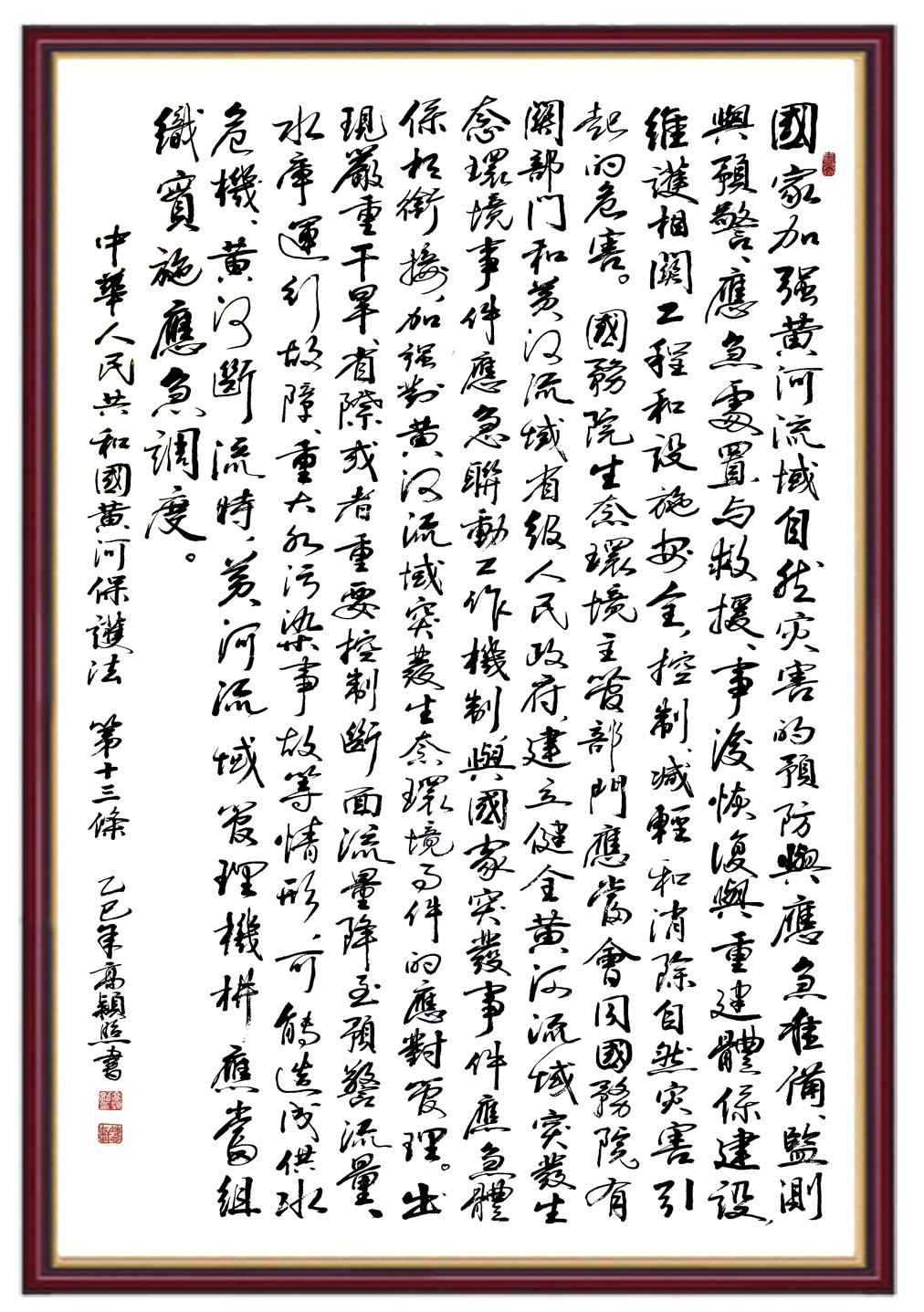 黃河寧,天下平。黃河是中華民族的發(fā)源地和搖籃,保護(hù)黃河是事關(guān)中華民族偉大復(fù)興的千秋大計?!吨腥A人民共和國黃河保護(hù)法》為推進(jìn)水資源節(jié)約集約利用、保護(hù)傳承弘揚(yáng)黃河文化、推動黃河流域生態(tài)保護(hù)和高質(zhì)量發(fā)展提供了有力法治保障。繼書寫《中華人民共和國民法典》《中華人民共和國憲法》《中華人民共和國澳門特別行政區(qū)基本法》《中華人民共和國香港特別行政區(qū)基本法》《中華人民共和國國旗法》《中華人民共和國國徽法》《中華人民共和國國歌法》《中華人民共和國法官法》等法律法規(guī)之后,法制日報社聯(lián)合沿黃九?。▍^(qū))司法廳、書法家協(xié)會,將筆端對準(zhǔn)《中華人民共和國黃河保護(hù)法》。
