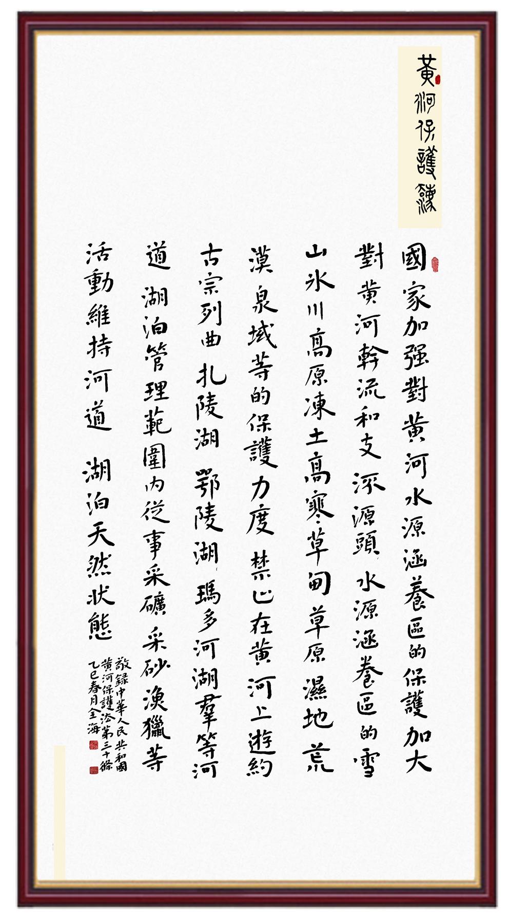 黃河寧,天下平。黃河是中華民族的發(fā)源地和搖籃,保護(hù)黃河是事關(guān)中華民族偉大復(fù)興的千秋大計?!吨腥A人民共和國黃河保護(hù)法》為推進(jìn)水資源節(jié)約集約利用、保護(hù)傳承弘揚黃河文化、推動黃河流域生態(tài)保護(hù)和高質(zhì)量發(fā)展提供了有力法治保障。繼書寫《中華人民共和國民法典》《中華人民共和國憲法》《中華人民共和國澳門特別行政區(qū)基本法》《中華人民共和國香港特別行政區(qū)基本法》《中華人民共和國國旗法》《中華人民共和國國徽法》《中華人民共和國國歌法》《中華人民共和國法官法》等法律法規(guī)之后,法制日報社聯(lián)合沿黃九?。▍^(qū))司法廳、書法家協(xié)會,將筆端對準(zhǔn)《中華人民共和國黃河保護(hù)法》。