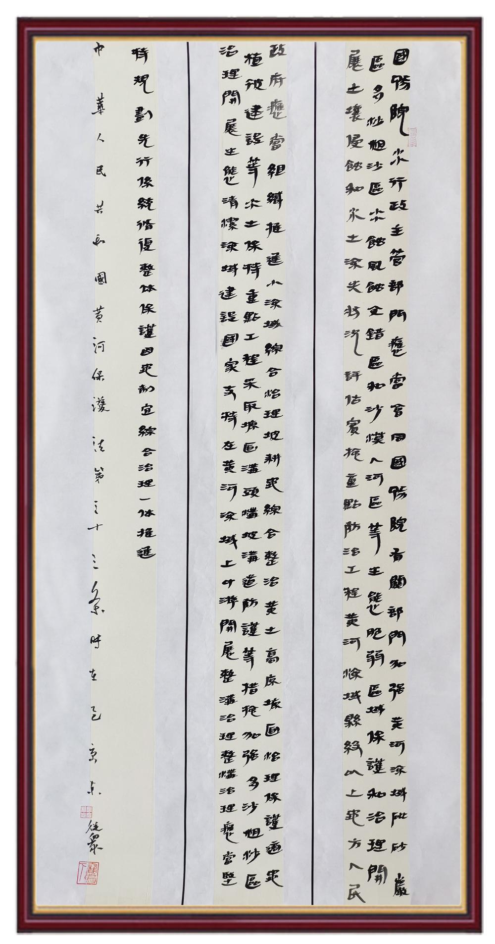 黃河寧,天下平。黃河是中華民族的發(fā)源地和搖籃,保護(hù)黃河是事關(guān)中華民族偉大復(fù)興的千秋大計(jì)?!吨腥A人民共和國(guó)黃河保護(hù)法》為推進(jìn)水資源節(jié)約集約利用、保護(hù)傳承弘揚(yáng)黃河文化、推動(dòng)黃河流域生態(tài)保護(hù)和高質(zhì)量發(fā)展提供了有力法治保障。繼書寫《中華人民共和國(guó)民法典》《中華人民共和國(guó)憲法》《中華人民共和國(guó)澳門特別行政區(qū)基本法》《中華人民共和國(guó)香港特別行政區(qū)基本法》《中華人民共和國(guó)國(guó)旗法》《中華人民共和國(guó)國(guó)徽法》《中華人民共和國(guó)國(guó)歌法》《中華人民共和國(guó)法官法》等法律法規(guī)之后,法制日?qǐng)?bào)社聯(lián)合沿黃九省(區(qū))司法廳、書法家協(xié)會(huì),將筆端對(duì)準(zhǔn)《中華人民共和國(guó)黃河保護(hù)法》。