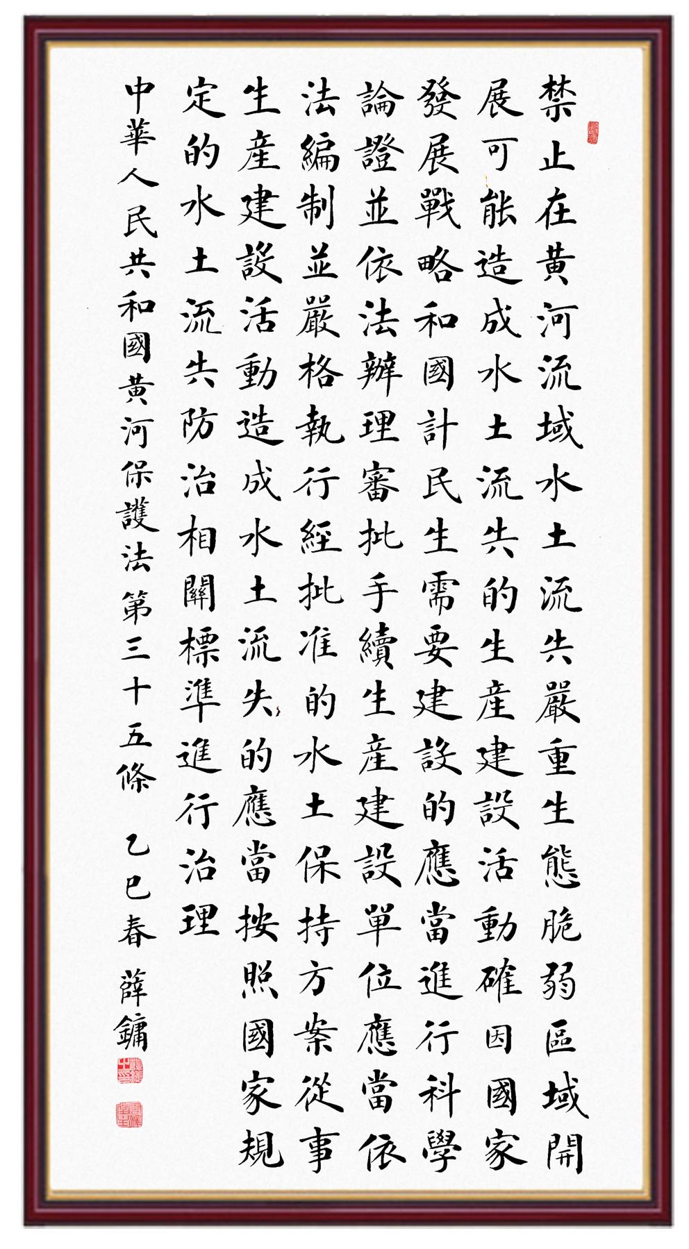 黃河寧,天下平。黃河是中華民族的發(fā)源地和搖籃,保護(hù)黃河是事關(guān)中華民族偉大復(fù)興的千秋大計(jì)?!吨腥A人民共和國黃河保護(hù)法》為推進(jìn)水資源節(jié)約集約利用、保護(hù)傳承弘揚(yáng)黃河文化、推動黃河流域生態(tài)保護(hù)和高質(zhì)量發(fā)展提供了有力法治保障。繼書寫《中華人民共和國民法典》《中華人民共和國憲法》《中華人民共和國澳門特別行政區(qū)基本法》《中華人民共和國香港特別行政區(qū)基本法》《中華人民共和國國旗法》《中華人民共和國國徽法》《中華人民共和國國歌法》《中華人民共和國法官法》等法律法規(guī)之后,法制日報(bào)社聯(lián)合沿黃九?。▍^(qū))司法廳、書法家協(xié)會,將筆端對準(zhǔn)《中華人民共和國黃河保護(hù)法》。
