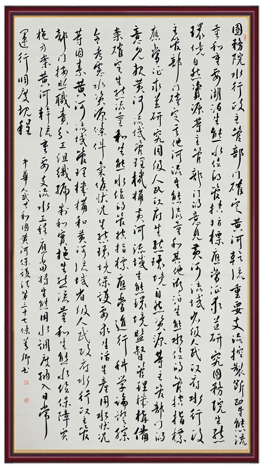 黃河寧,天下平。黃河是中華民族的發(fā)源地和搖籃,保護(hù)黃河是事關(guān)中華民族偉大復(fù)興的千秋大計?!吨腥A人民共和國黃河保護(hù)法》為推進(jìn)水資源節(jié)約集約利用、保護(hù)傳承弘揚(yáng)黃河文化、推動黃河流域生態(tài)保護(hù)和高質(zhì)量發(fā)展提供了有力法治保障。繼書寫《中華人民共和國民法典》《中華人民共和國憲法》《中華人民共和國澳門特別行政區(qū)基本法》《中華人民共和國香港特別行政區(qū)基本法》《中華人民共和國國旗法》《中華人民共和國國徽法》《中華人民共和國國歌法》《中華人民共和國法官法》等法律法規(guī)之后,法制日報社聯(lián)合沿黃九?。▍^(qū))司法廳、書法家協(xié)會,將筆端對準(zhǔn)《中華人民共和國黃河保護(hù)法》。