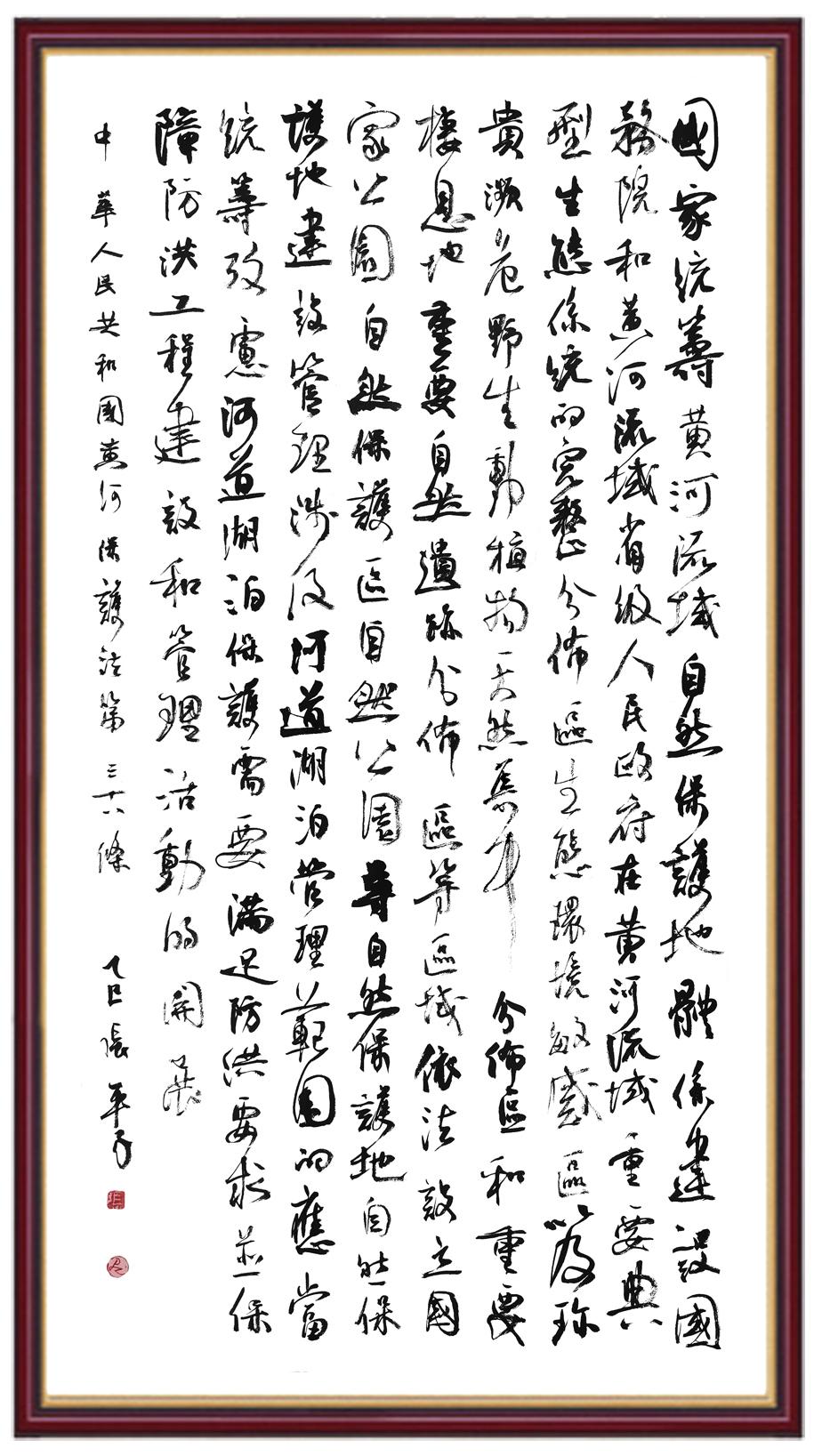 黃河寧,天下平。黃河是中華民族的發(fā)源地和搖籃,保護(hù)黃河是事關(guān)中華民族偉大復(fù)興的千秋大計(jì)?!吨腥A人民共和國黃河保護(hù)法》為推進(jìn)水資源節(jié)約集約利用、保護(hù)傳承弘揚(yáng)黃河文化、推動(dòng)黃河流域生態(tài)保護(hù)和高質(zhì)量發(fā)展提供了有力法治保障。繼書寫《中華人民共和國民法典》《中華人民共和國憲法》《中華人民共和國澳門特別行政區(qū)基本法》《中華人民共和國香港特別行政區(qū)基本法》《中華人民共和國國旗法》《中華人民共和國國徽法》《中華人民共和國國歌法》《中華人民共和國法官法》等法律法規(guī)之后,法制日報(bào)社聯(lián)合沿黃九省(區(qū))司法廳、書法家協(xié)會(huì),將筆端對準(zhǔn)《中華人民共和國黃河保護(hù)法》。