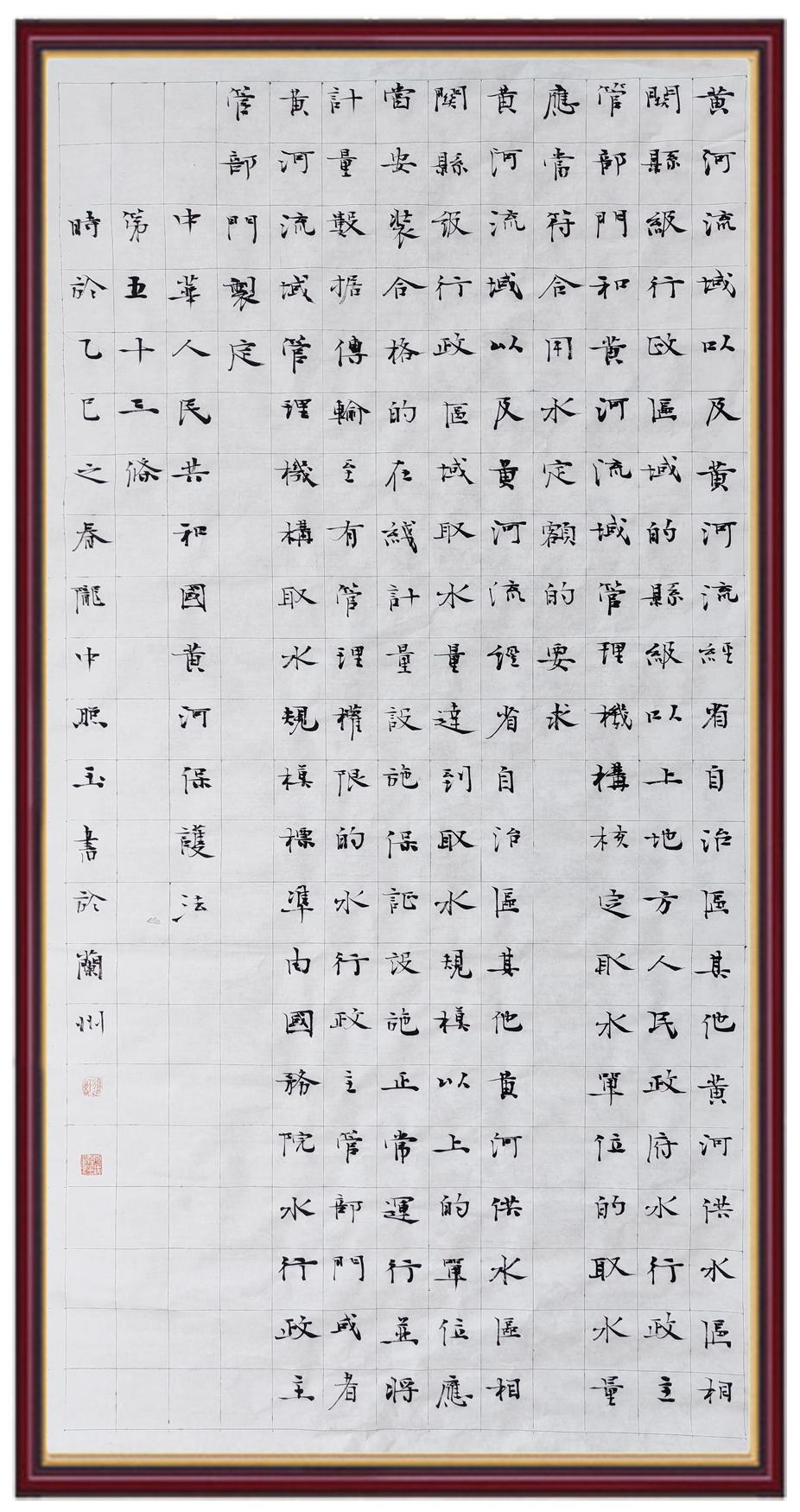 黃河寧,天下平。黃河是中華民族的發(fā)源地和搖籃,保護黃河是事關(guān)中華民族偉大復(fù)興的千秋大計?!吨腥A人民共和國黃河保護法》為推進水資源節(jié)約集約利用、保護傳承弘揚黃河文化、推動黃河流域生態(tài)保護和高質(zhì)量發(fā)展提供了有力法治保障。繼書寫《中華人民共和國民法典》《中華人民共和國憲法》《中華人民共和國澳門特別行政區(qū)基本法》《中華人民共和國香港特別行政區(qū)基本法》《中華人民共和國國旗法》《中華人民共和國國徽法》《中華人民共和國國歌法》《中華人民共和國法官法》等法律法規(guī)之后,法制日報社聯(lián)合沿黃九省(區(qū))司法廳、書法家協(xié)會,將筆端對準《中華人民共和國黃河保護法》。