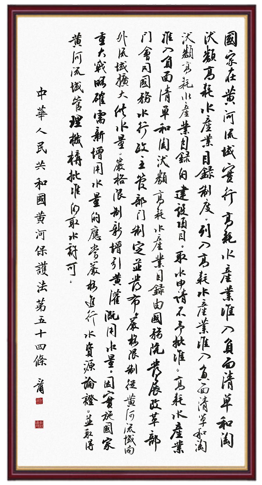 黃河寧,天下平。黃河是中華民族的發(fā)源地和搖籃,保護(hù)黃河是事關(guān)中華民族偉大復(fù)興的千秋大計。《中華人民共和國黃河保護(hù)法》為推進(jìn)水資源節(jié)約集約利用、保護(hù)傳承弘揚(yáng)黃河文化、推動黃河流域生態(tài)保護(hù)和高質(zhì)量發(fā)展提供了有力法治保障。繼書寫《中華人民共和國民法典》《中華人民共和國憲法》《中華人民共和國澳門特別行政區(qū)基本法》《中華人民共和國香港特別行政區(qū)基本法》《中華人民共和國國旗法》《中華人民共和國國徽法》《中華人民共和國國歌法》《中華人民共和國法官法》等法律法規(guī)之后,法制日報社聯(lián)合沿黃九?。▍^(qū))司法廳、書法家協(xié)會,將筆端對準(zhǔn)《中華人民共和國黃河保護(hù)法》。