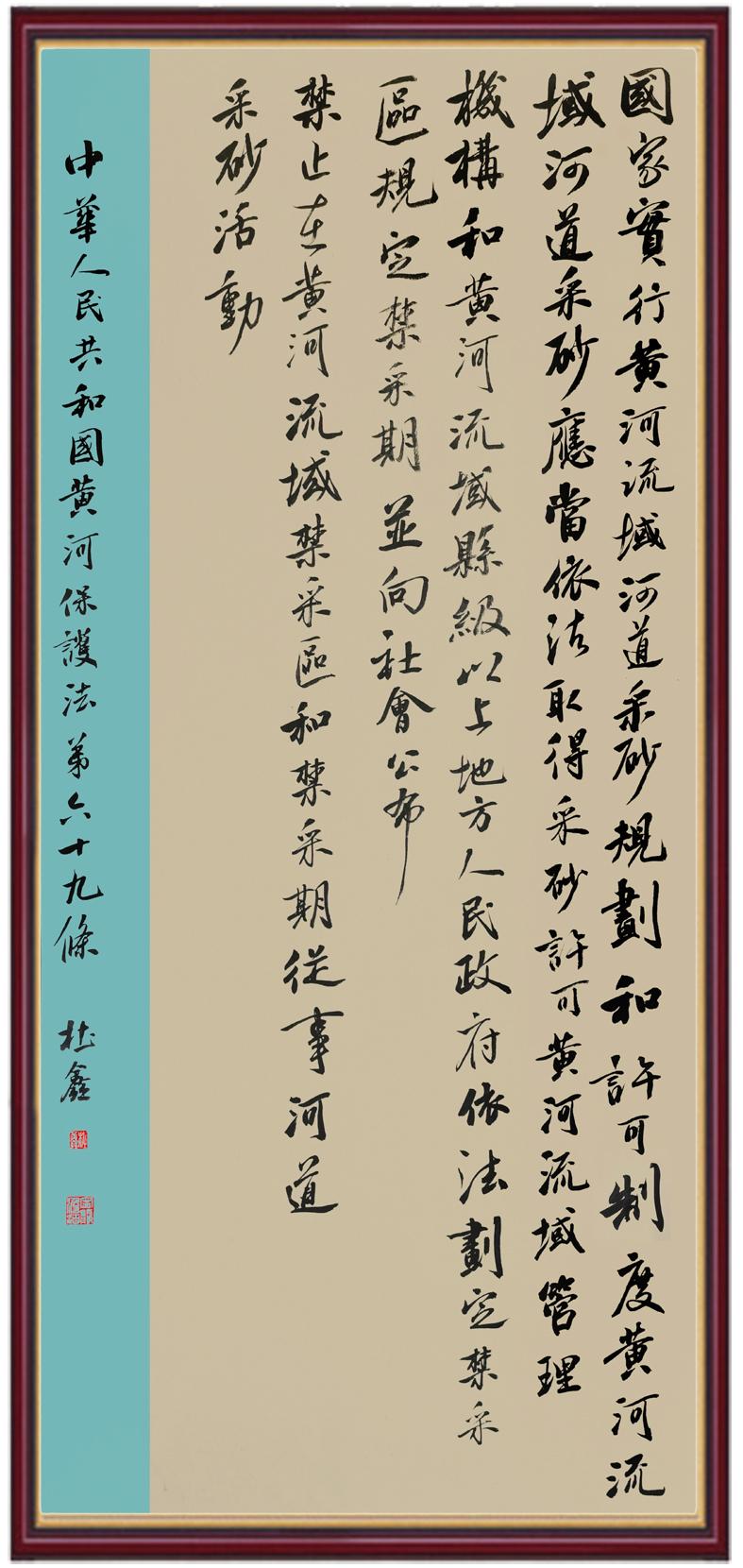 黃河寧,天下平。黃河是中華民族的發(fā)源地和搖籃,保護(hù)黃河是事關(guān)中華民族偉大復(fù)興的千秋大計(jì)?!吨腥A人民共和國(guó)黃河保護(hù)法》為推進(jìn)水資源節(jié)約集約利用、保護(hù)傳承弘揚(yáng)黃河文化、推動(dòng)黃河流域生態(tài)保護(hù)和高質(zhì)量發(fā)展提供了有力法治保障。繼書寫《中華人民共和國(guó)民法典》《中華人民共和國(guó)憲法》《中華人民共和國(guó)澳門特別行政區(qū)基本法》《中華人民共和國(guó)香港特別行政區(qū)基本法》《中華人民共和國(guó)國(guó)旗法》《中華人民共和國(guó)國(guó)徽法》《中華人民共和國(guó)國(guó)歌法》《中華人民共和國(guó)法官法》等法律法規(guī)之后,法制日?qǐng)?bào)社聯(lián)合沿黃九?。▍^(qū))司法廳、書法家協(xié)會(huì),將筆端對(duì)準(zhǔn)《中華人民共和國(guó)黃河保護(hù)法》。