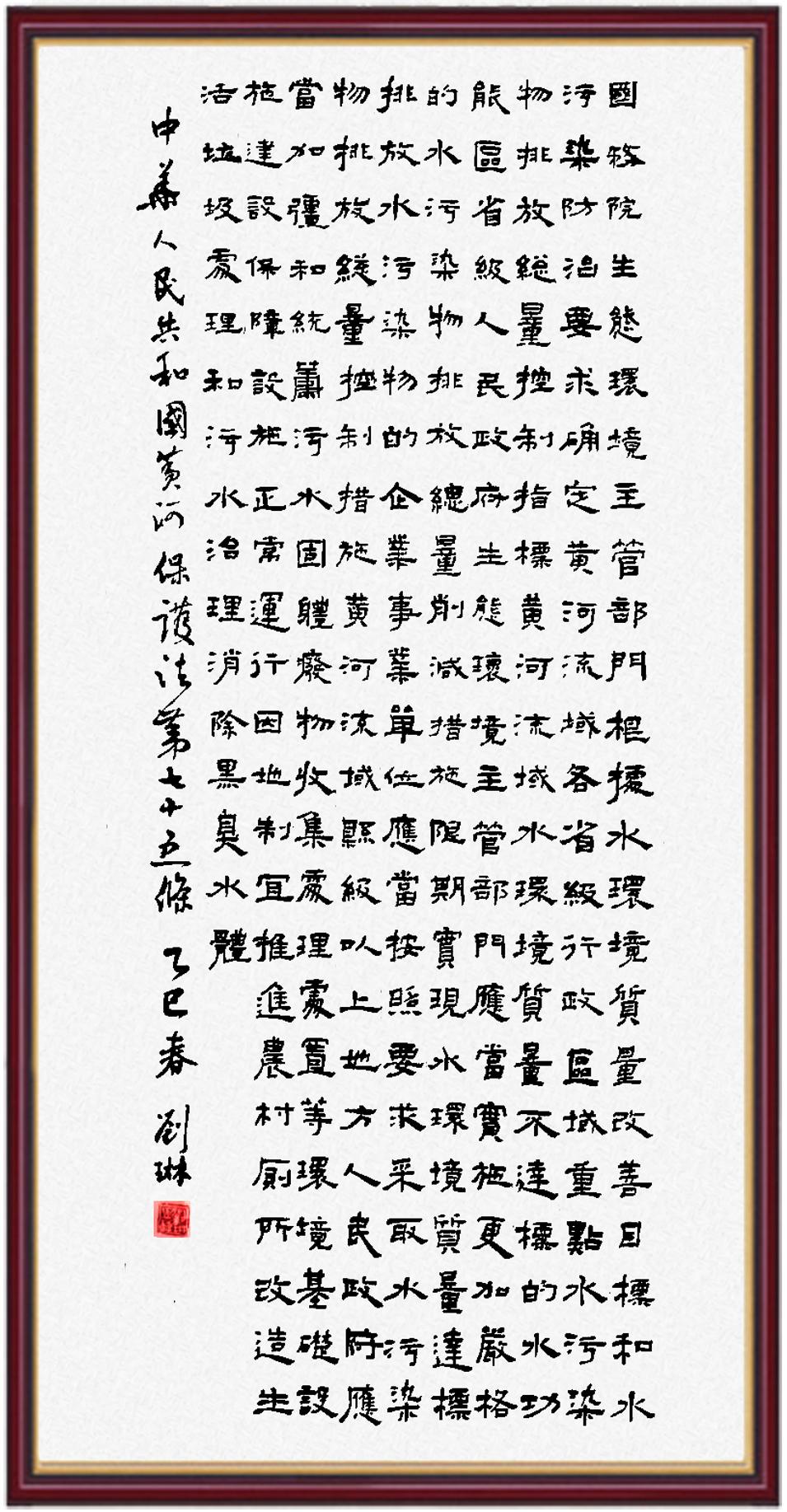 黃河寧,天下平。黃河是中華民族的發(fā)源地和搖籃,保護(hù)黃河是事關(guān)中華民族偉大復(fù)興的千秋大計(jì)?!吨腥A人民共和國(guó)黃河保護(hù)法》為推進(jìn)水資源節(jié)約集約利用、保護(hù)傳承弘揚(yáng)黃河文化、推動(dòng)黃河流域生態(tài)保護(hù)和高質(zhì)量發(fā)展提供了有力法治保障。繼書(shū)寫(xiě)《中華人民共和國(guó)民法典》《中華人民共和國(guó)憲法》《中華人民共和國(guó)澳門(mén)特別行政區(qū)基本法》《中華人民共和國(guó)香港特別行政區(qū)基本法》《中華人民共和國(guó)國(guó)旗法》《中華人民共和國(guó)國(guó)徽法》《中華人民共和國(guó)國(guó)歌法》《中華人民共和國(guó)法官法》等法律法規(guī)之后,法制日?qǐng)?bào)社聯(lián)合沿黃九?。▍^(qū))司法廳、書(shū)法家協(xié)會(huì),將筆端對(duì)準(zhǔn)《中華人民共和國(guó)黃河保護(hù)法》。