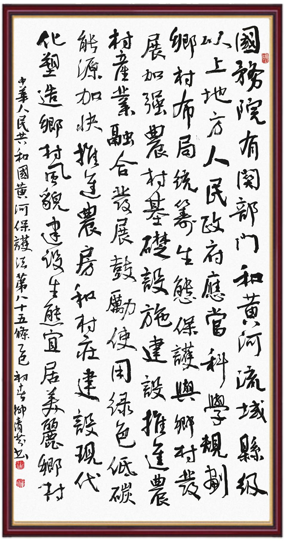 黃河寧,天下平。黃河是中華民族的發(fā)源地和搖籃,保護(hù)黃河是事關(guān)中華民族偉大復(fù)興的千秋大計(jì)?!吨腥A人民共和國黃河保護(hù)法》為推進(jìn)水資源節(jié)約集約利用、保護(hù)傳承弘揚(yáng)黃河文化、推動(dòng)黃河流域生態(tài)保護(hù)和高質(zhì)量發(fā)展提供了有力法治保障。繼書寫《中華人民共和國民法典》《中華人民共和國憲法》《中華人民共和國澳門特別行政區(qū)基本法》《中華人民共和國香港特別行政區(qū)基本法》《中華人民共和國國旗法》《中華人民共和國國徽法》《中華人民共和國國歌法》《中華人民共和國法官法》等法律法規(guī)之后,法制日?qǐng)?bào)社聯(lián)合沿黃九?。▍^(qū))司法廳、書法家協(xié)會(huì),將筆端對(duì)準(zhǔn)《中華人民共和國黃河保護(hù)法》。
