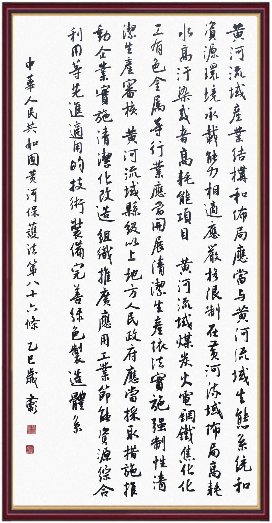 黃河寧,天下平。黃河是中華民族的發(fā)源地和搖籃,保護(hù)黃河是事關(guān)中華民族偉大復(fù)興的千秋大計(jì)?!吨腥A人民共和國(guó)黃河保護(hù)法》為推進(jìn)水資源節(jié)約集約利用、保護(hù)傳承弘揚(yáng)黃河文化、推動(dòng)黃河流域生態(tài)保護(hù)和高質(zhì)量發(fā)展提供了有力法治保障。繼書寫《中華人民共和國(guó)民法典》《中華人民共和國(guó)憲法》《中華人民共和國(guó)澳門特別行政區(qū)基本法》《中華人民共和國(guó)香港特別行政區(qū)基本法》《中華人民共和國(guó)國(guó)旗法》《中華人民共和國(guó)國(guó)徽法》《中華人民共和國(guó)國(guó)歌法》《中華人民共和國(guó)法官法》等法律法規(guī)之后,法制日?qǐng)?bào)社聯(lián)合沿黃九?。▍^(qū))司法廳、書法家協(xié)會(huì),將筆端對(duì)準(zhǔn)《中華人民共和國(guó)黃河保護(hù)法》。