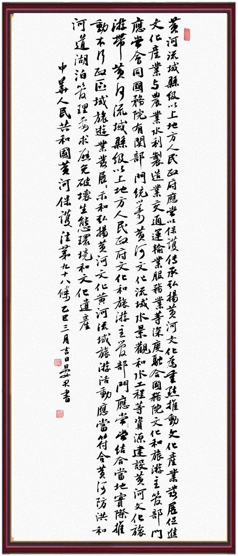 黃河寧,天下平。黃河是中華民族的發(fā)源地和搖籃,保護黃河是事關(guān)中華民族偉大復(fù)興的千秋大計?!吨腥A人民共和國黃河保護法》為推進水資源節(jié)約集約利用、保護傳承弘揚黃河文化、推動黃河流域生態(tài)保護和高質(zhì)量發(fā)展提供了有力法治保障。繼書寫《中華人民共和國民法典》《中華人民共和國憲法》《中華人民共和國澳門特別行政區(qū)基本法》《中華人民共和國香港特別行政區(qū)基本法》《中華人民共和國國旗法》《中華人民共和國國徽法》《中華人民共和國國歌法》《中華人民共和國法官法》等法律法規(guī)之后,法制日報社聯(lián)合沿黃九?。▍^(qū))司法廳、書法家協(xié)會,將筆端對準《中華人民共和國黃河保護法》。