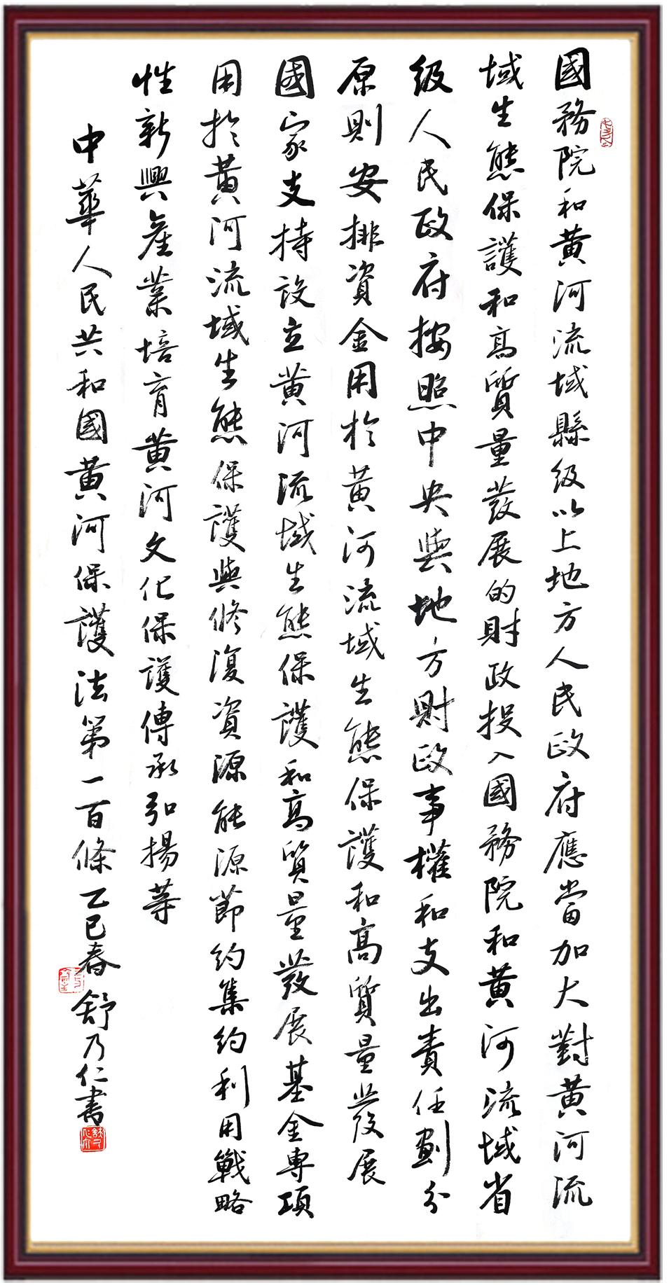 黃河寧,天下平。黃河是中華民族的發(fā)源地和搖籃,保護黃河是事關(guān)中華民族偉大復興的千秋大計?!吨腥A人民共和國黃河保護法》為推進水資源節(jié)約集約利用、保護傳承弘揚黃河文化、推動黃河流域生態(tài)保護和高質(zhì)量發(fā)展提供了有力法治保障。繼書寫《中華人民共和國民法典》《中華人民共和國憲法》《中華人民共和國澳門特別行政區(qū)基本法》《中華人民共和國香港特別行政區(qū)基本法》《中華人民共和國國旗法》《中華人民共和國國徽法》《中華人民共和國國歌法》《中華人民共和國法官法》等法律法規(guī)之后,法制日報社聯(lián)合沿黃九?。▍^(qū))司法廳、書法家協(xié)會,將筆端對準《中華人民共和國黃河保護法》。