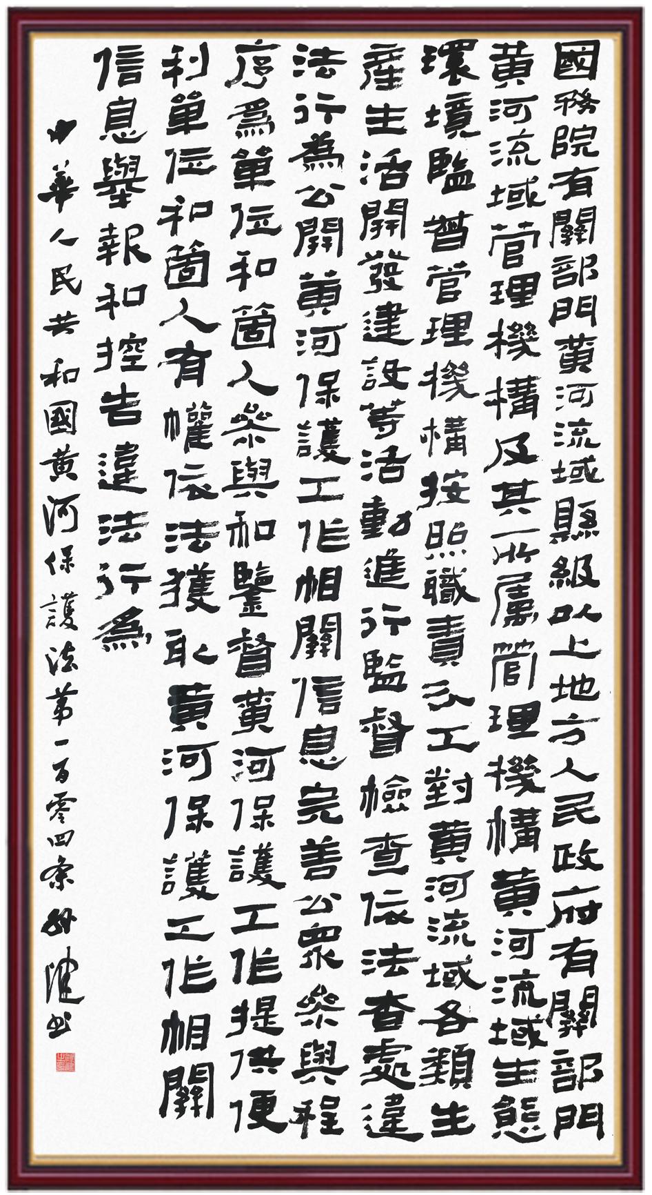 黃河寧,天下平。黃河是中華民族的發(fā)源地和搖籃,保護(hù)黃河是事關(guān)中華民族偉大復(fù)興的千秋大計?!吨腥A人民共和國黃河保護(hù)法》為推進(jìn)水資源節(jié)約集約利用、保護(hù)傳承弘揚黃河文化、推動黃河流域生態(tài)保護(hù)和高質(zhì)量發(fā)展提供了有力法治保障。繼書寫《中華人民共和國民法典》《中華人民共和國憲法》《中華人民共和國澳門特別行政區(qū)基本法》《中華人民共和國香港特別行政區(qū)基本法》《中華人民共和國國旗法》《中華人民共和國國徽法》《中華人民共和國國歌法》《中華人民共和國法官法》等法律法規(guī)之后,法制日報社聯(lián)合沿黃九省(區(qū))司法廳、書法家協(xié)會,將筆端對準(zhǔn)《中華人民共和國黃河保護(hù)法》。