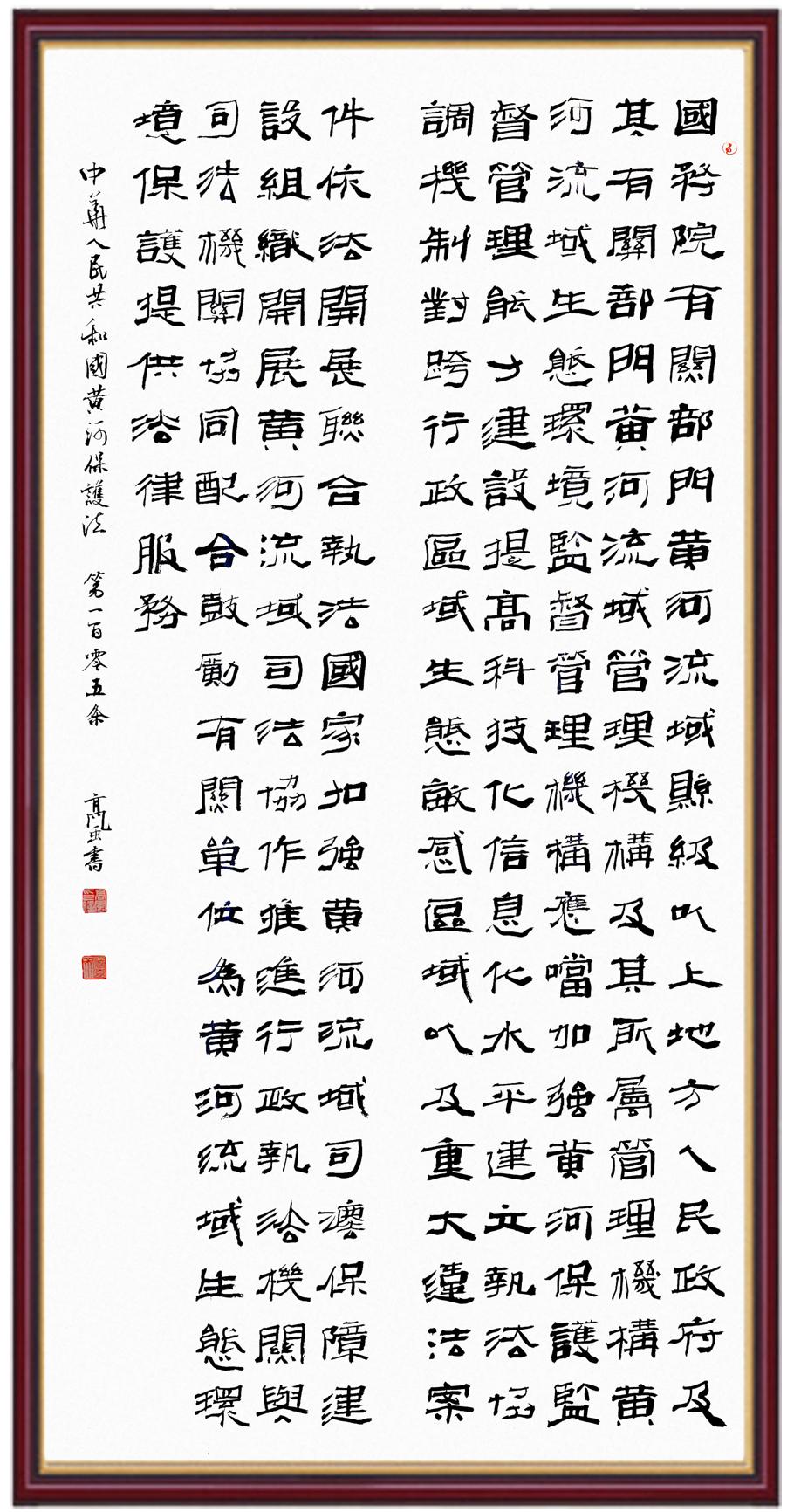 黃河寧,天下平。黃河是中華民族的發(fā)源地和搖籃,保護(hù)黃河是事關(guān)中華民族偉大復(fù)興的千秋大計(jì)?!吨腥A人民共和國(guó)黃河保護(hù)法》為推進(jìn)水資源節(jié)約集約利用、保護(hù)傳承弘揚(yáng)黃河文化、推動(dòng)黃河流域生態(tài)保護(hù)和高質(zhì)量發(fā)展提供了有力法治保障。繼書(shū)寫(xiě)《中華人民共和國(guó)民法典》《中華人民共和國(guó)憲法》《中華人民共和國(guó)澳門(mén)特別行政區(qū)基本法》《中華人民共和國(guó)香港特別行政區(qū)基本法》《中華人民共和國(guó)國(guó)旗法》《中華人民共和國(guó)國(guó)徽法》《中華人民共和國(guó)國(guó)歌法》《中華人民共和國(guó)法官法》等法律法規(guī)之后,法制日?qǐng)?bào)社聯(lián)合沿黃九省(區(qū))司法廳、書(shū)法家協(xié)會(huì),將筆端對(duì)準(zhǔn)《中華人民共和國(guó)黃河保護(hù)法》。
