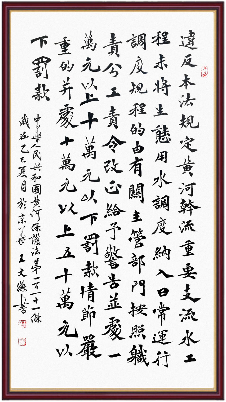 黃河寧,天下平。黃河是中華民族的發(fā)源地和搖籃,保護黃河是事關(guān)中華民族偉大復(fù)興的千秋大計?!吨腥A人民共和國黃河保護法》為推進水資源節(jié)約集約利用、保護傳承弘揚黃河文化、推動黃河流域生態(tài)保護和高質(zhì)量發(fā)展提供了有力法治保障。繼書寫《中華人民共和國民法典》《中華人民共和國憲法》《中華人民共和國澳門特別行政區(qū)基本法》《中華人民共和國香港特別行政區(qū)基本法》《中華人民共和國國旗法》《中華人民共和國國徽法》《中華人民共和國國歌法》《中華人民共和國法官法》等法律法規(guī)之后,法制日報社聯(lián)合沿黃九省(區(qū))司法廳、書法家協(xié)會,將筆端對準(zhǔn)《中華人民共和國黃河保護法》。