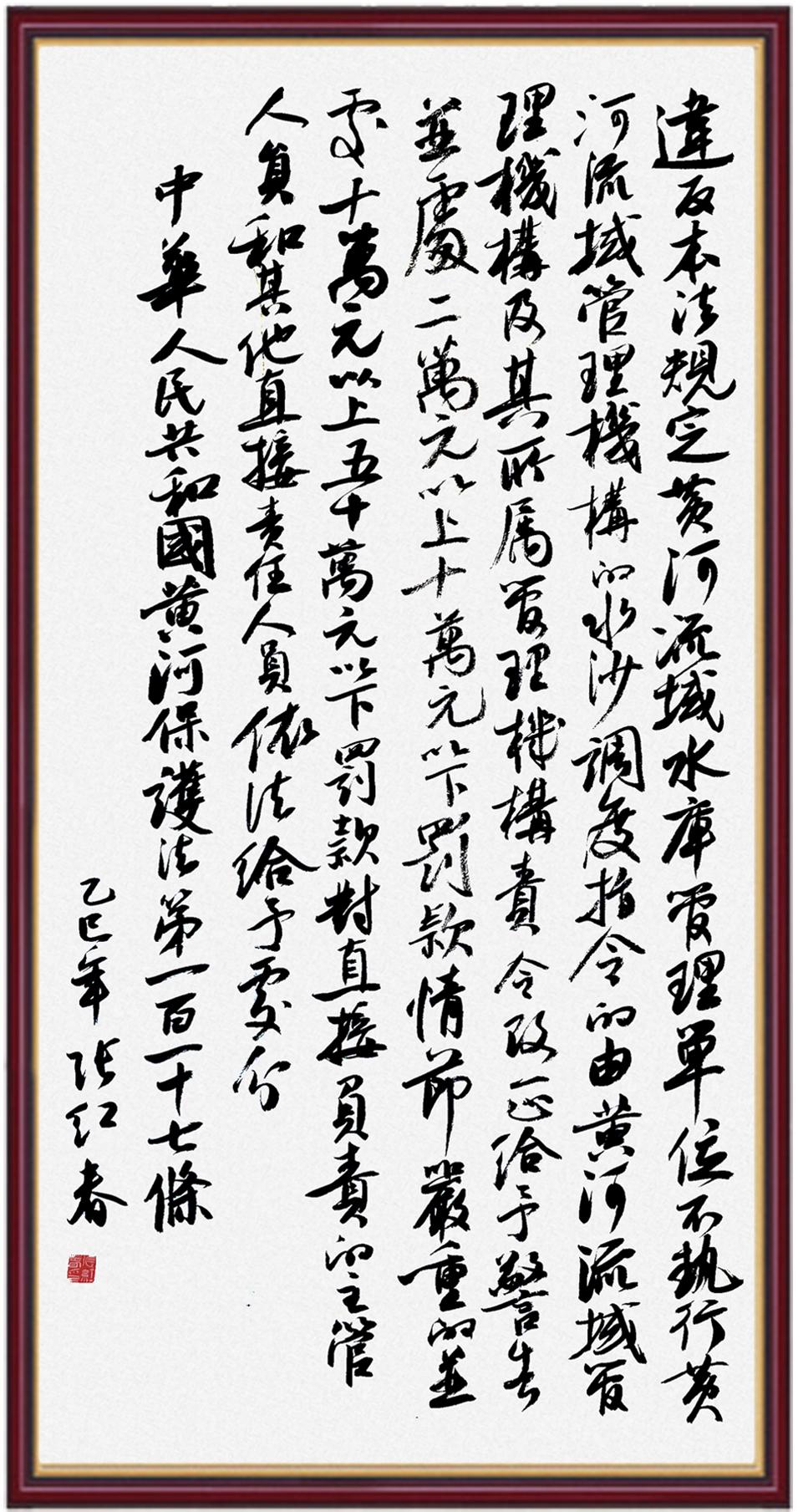 黃河寧,天下平。黃河是中華民族的發(fā)源地和搖籃,保護黃河是事關(guān)中華民族偉大復(fù)興的千秋大計?!吨腥A人民共和國黃河保護法》為推進水資源節(jié)約集約利用、保護傳承弘揚黃河文化、推動黃河流域生態(tài)保護和高質(zhì)量發(fā)展提供了有力法治保障。繼書寫《中華人民共和國民法典》《中華人民共和國憲法》《中華人民共和國澳門特別行政區(qū)基本法》《中華人民共和國香港特別行政區(qū)基本法》《中華人民共和國國旗法》《中華人民共和國國徽法》《中華人民共和國國歌法》《中華人民共和國法官法》等法律法規(guī)之后,法制日報社聯(lián)合沿黃九省(區(qū))司法廳、書法家協(xié)會,將筆端對準(zhǔn)《中華人民共和國黃河保護法》。
