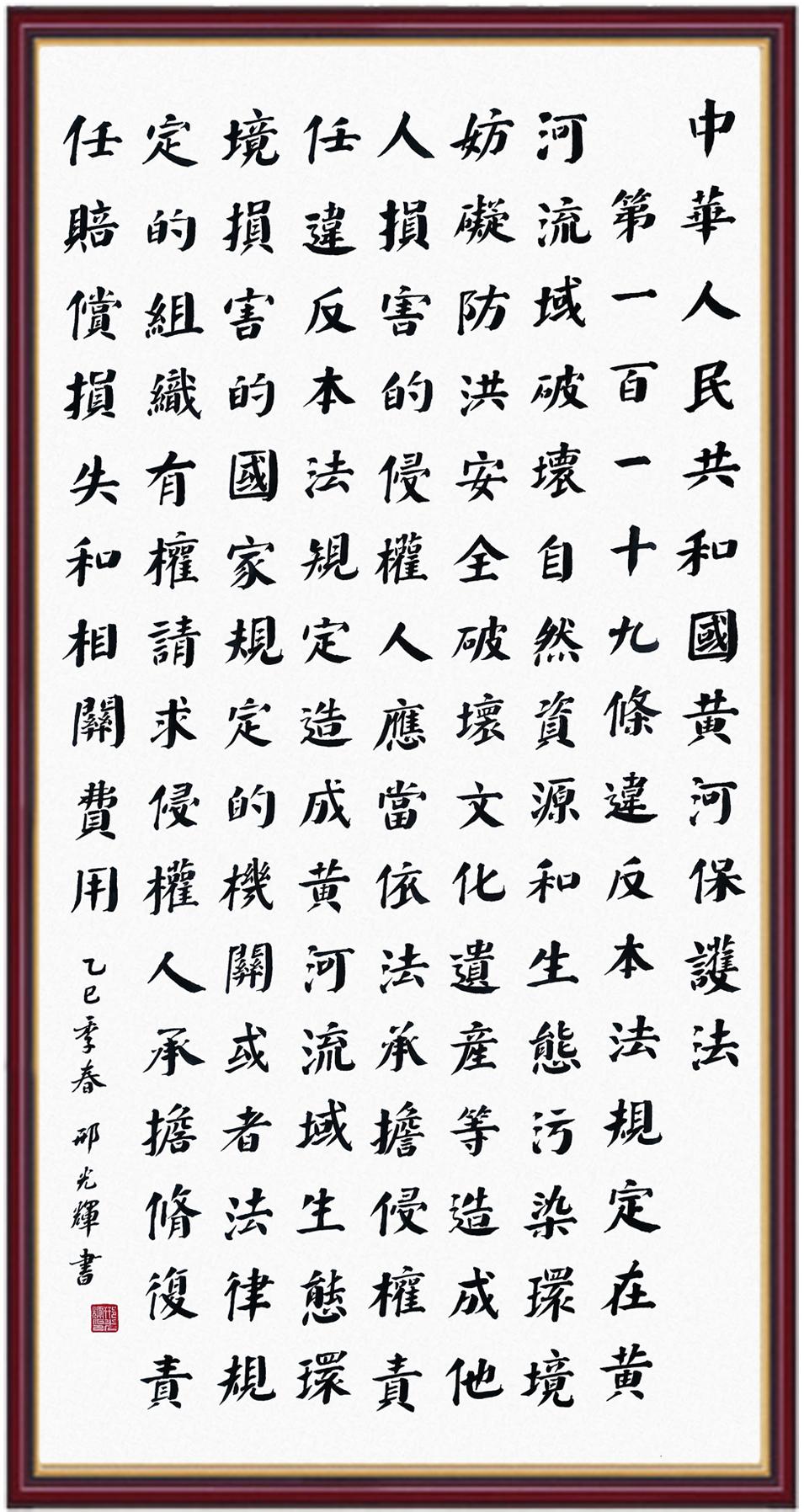 黃河寧,天下平。黃河是中華民族的發(fā)源地和搖籃,保護(hù)黃河是事關(guān)中華民族偉大復(fù)興的千秋大計(jì)。《中華人民共和國黃河保護(hù)法》為推進(jìn)水資源節(jié)約集約利用、保護(hù)傳承弘揚(yáng)黃河文化、推動(dòng)黃河流域生態(tài)保護(hù)和高質(zhì)量發(fā)展提供了有力法治保障。繼書寫《中華人民共和國民法典》《中華人民共和國憲法》《中華人民共和國澳門特別行政區(qū)基本法》《中華人民共和國香港特別行政區(qū)基本法》《中華人民共和國國旗法》《中華人民共和國國徽法》《中華人民共和國國歌法》《中華人民共和國法官法》等法律法規(guī)之后,法制日?qǐng)?bào)社聯(lián)合沿黃九省(區(qū))司法廳、書法家協(xié)會(huì),將筆端對(duì)準(zhǔn)《中華人民共和國黃河保護(hù)法》。