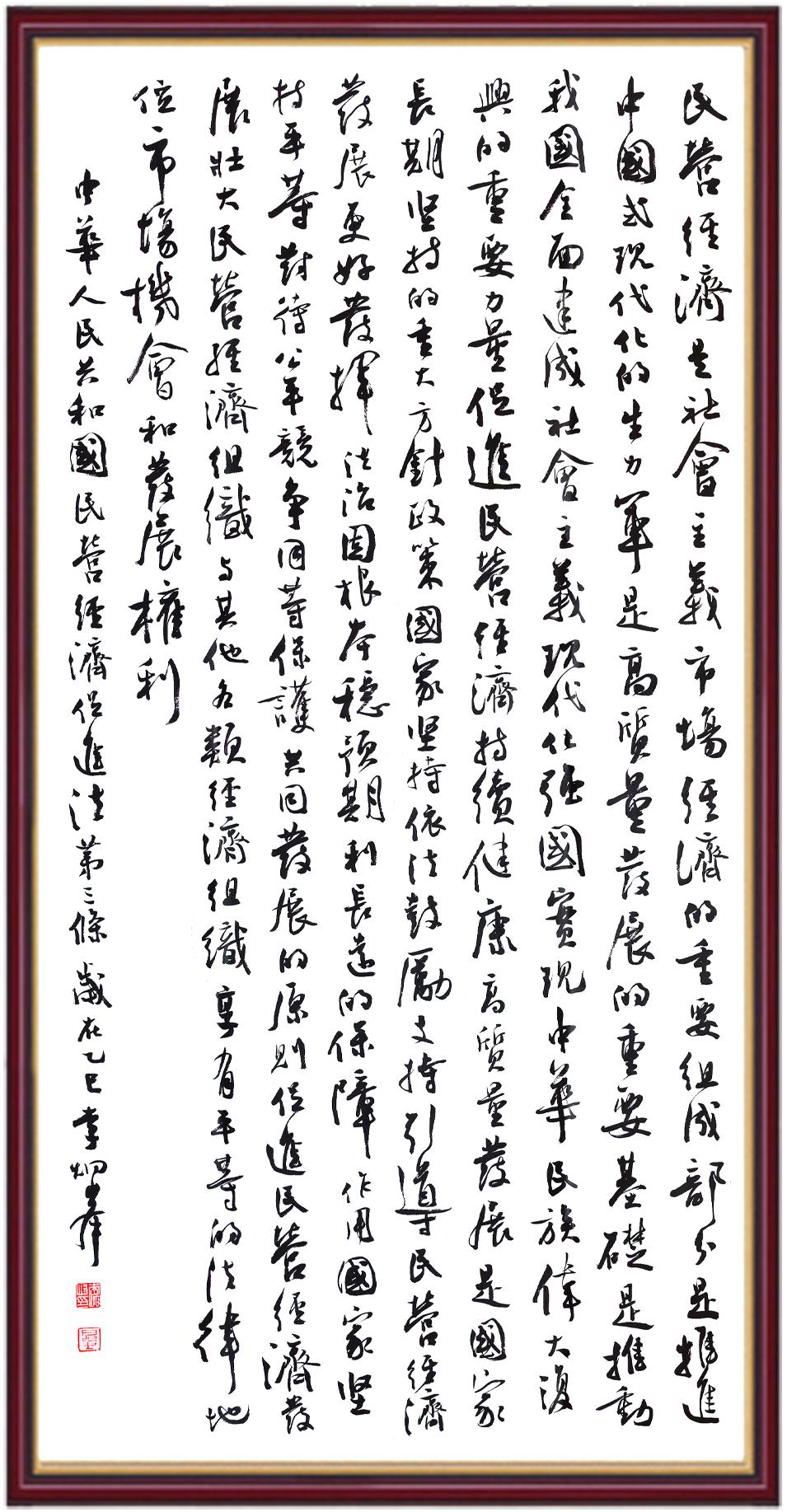 《中華人民共和國民營經(jīng)濟(jì)促進(jìn)法》自今年5月20日起施行。作為我國首部專門關(guān)于民營經(jīng)濟(jì)發(fā)展的基礎(chǔ)性法律,民營經(jīng)濟(jì)促進(jìn)法將支持和保障民營經(jīng)濟(jì)發(fā)展的法律制度融入中國特色社會主義法律體系,具有重大的法治意義,為促進(jìn)民營經(jīng)濟(jì)持續(xù)、健康、高質(zhì)量發(fā)展提供了堅實的法治保障。為更好地學(xué)習(xí)、宣傳、貫徹這部法律,法治日報社聯(lián)合司法部普法與依法治理局,開展“‘書·法’系列活動之書寫《中華人民共和國民營經(jīng)濟(jì)促進(jìn)法》”活動。