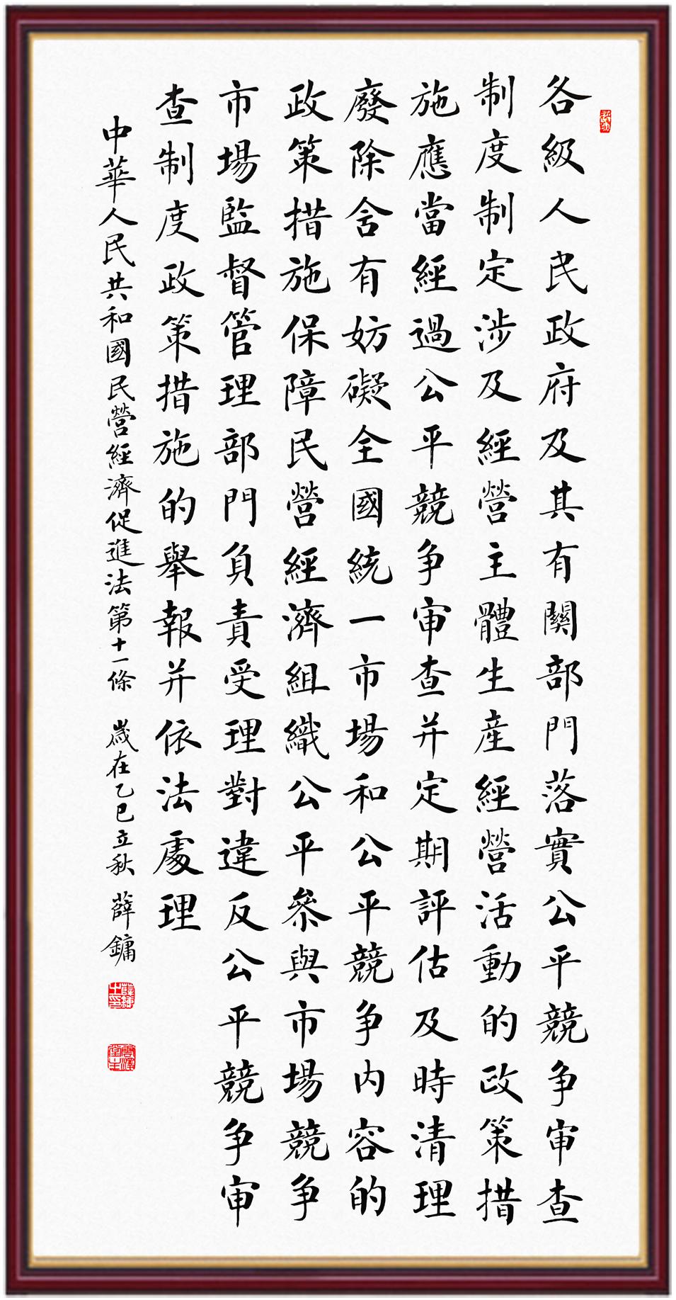 《中華人民共和國(guó)民營(yíng)經(jīng)濟(jì)促進(jìn)法》自今年5月20日起施行。作為我國(guó)首部專門關(guān)于民營(yíng)經(jīng)濟(jì)發(fā)展的基礎(chǔ)性法律,民營(yíng)經(jīng)濟(jì)促進(jìn)法將支持和保障民營(yíng)經(jīng)濟(jì)發(fā)展的法律制度融入中國(guó)特色社會(huì)主義法律體系,具有重大的法治意義,為促進(jìn)民營(yíng)經(jīng)濟(jì)持續(xù)、健康、高質(zhì)量發(fā)展提供了堅(jiān)實(shí)的法治保障。為更好地學(xué)習(xí)、宣傳、貫徹這部法律,法治日?qǐng)?bào)社聯(lián)合司法部普法與依法治理局,開展“‘書·法’系列活動(dòng)之書寫《中華人民共和國(guó)民營(yíng)經(jīng)濟(jì)促進(jìn)法》”活動(dòng)。