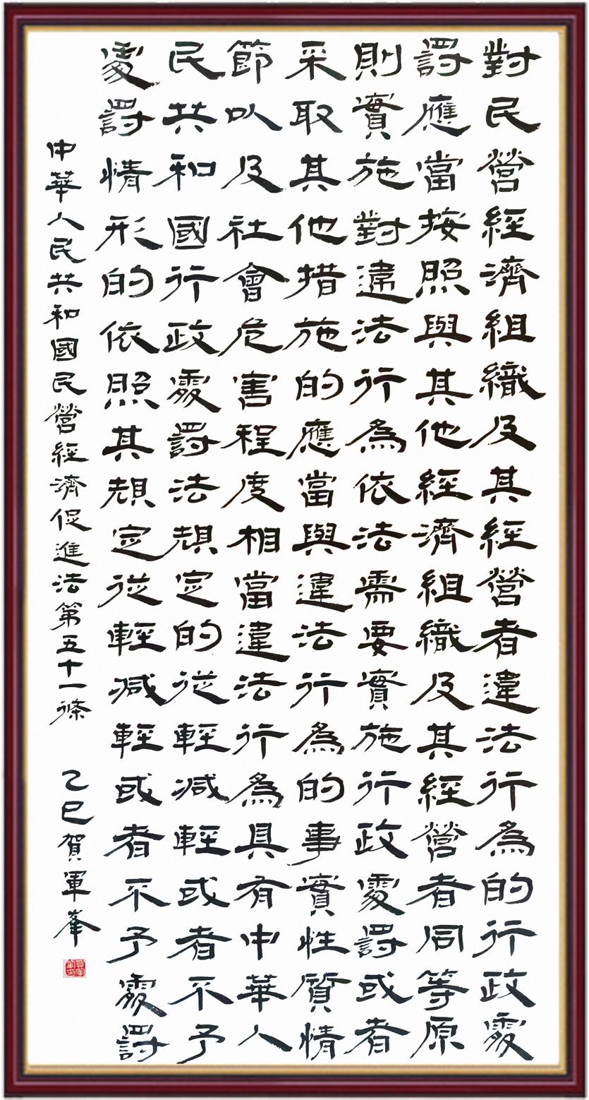 《中華人民共和國民營經(jīng)濟促進法》自今年5月20日起施行。作為我國首部專門關(guān)于民營經(jīng)濟發(fā)展的基礎(chǔ)性法律,民營經(jīng)濟促進法將支持和保障民營經(jīng)濟發(fā)展的法律制度融入中國特色社會主義法律體系,具有重大的法治意義,為促進民營經(jīng)濟持續(xù)、健康、高質(zhì)量發(fā)展提供了堅實的法治保障。為更好地學(xué)習(xí)、宣傳、貫徹這部法律,法治日報社聯(lián)合司法部普法與依法治理局,開展“‘書·法’系列活動之書寫《中華人民共和國民營經(jīng)濟促進法》”活動。